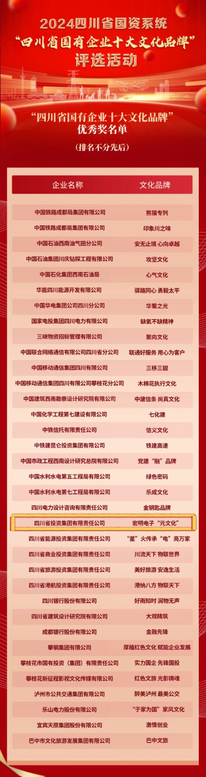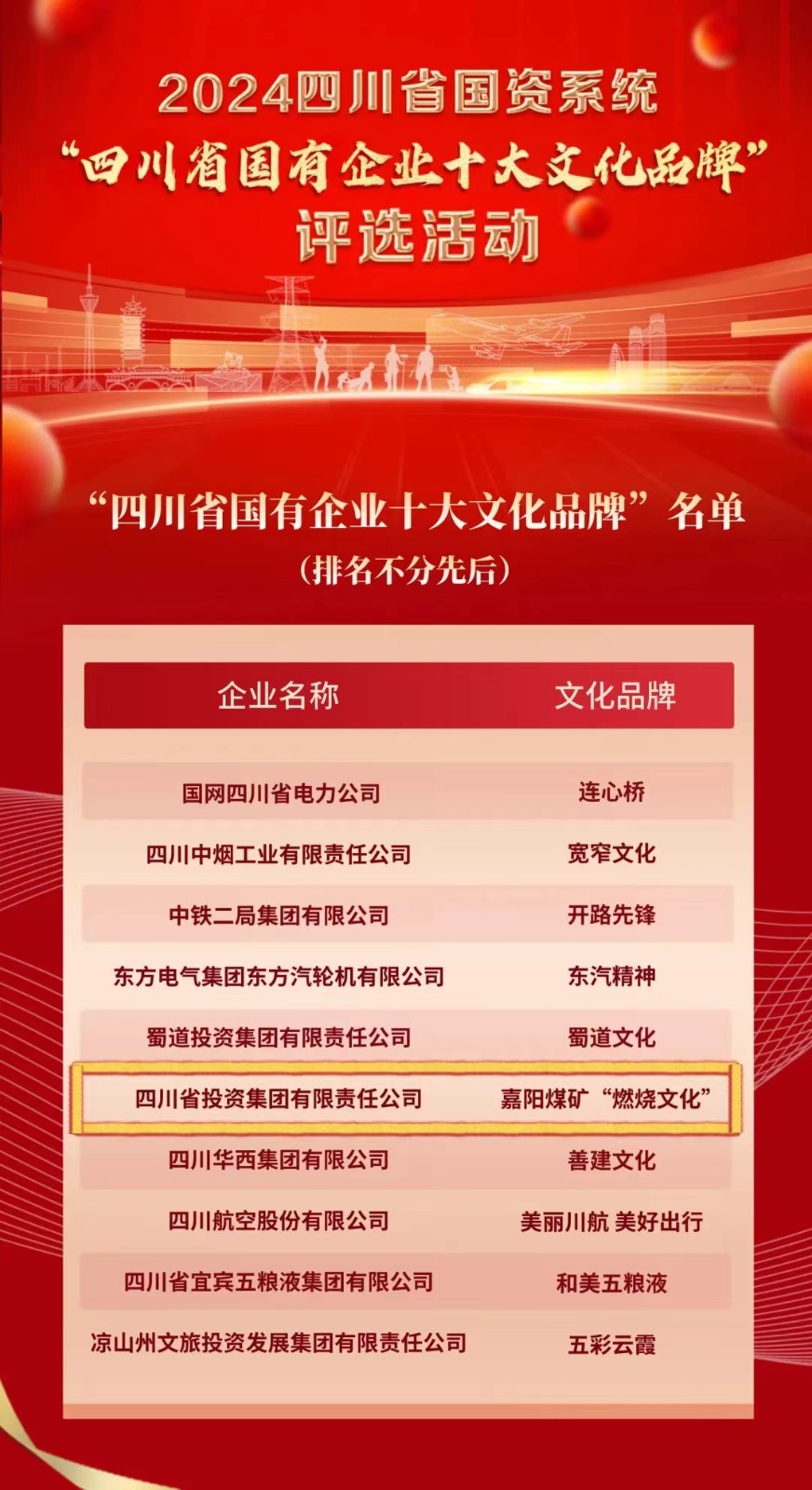 5月28日,省国资委正式发布“四川省国有企业十大文化品牌”名单和10个提名奖、35个优秀奖品牌名单,川投集团榜上有名。其中,川投集团嘉阳煤矿“燃烧文化”获评“四川省国有企业十大文化品牌”,宏明电子“元文化”获评“四川省国有企业十大文化品牌”优秀奖。