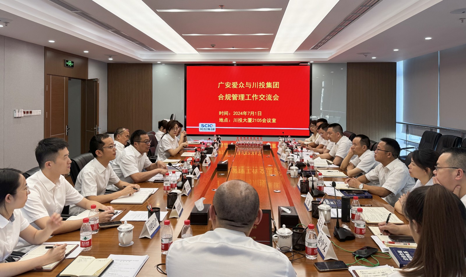 广安市纪委监委驻爱众股份纪检监察组组长、党委委员、纪委书记秦毅,爱众股份纪委办公室、审计法务部、各风控中心负责人及相关人员,集团公司法务风控部全体人员,川投能源、川投新能源、川投大健康、川投信产、华西牙科、川投国际等6户所属企业相关人员参加交流。