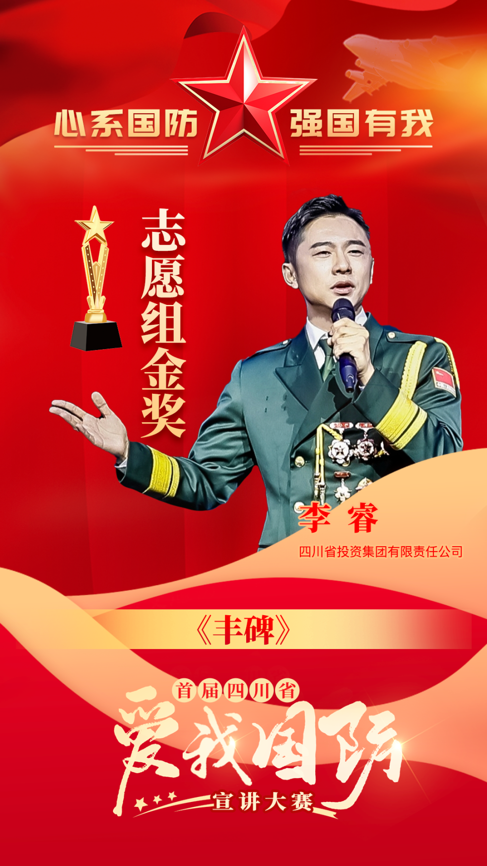 7月8日,首届四川省“爱我国防”宣讲大赛成果展演在成都举行,来自全省21个市州和省直有关部门的170名选手代表参与展演,展示大赛成果,并现场揭晓大赛决出的金奖和银奖获得者。川投集团所属川投能源李睿和其作品《丰碑》从集团初赛、省国资国企系统赛中层层胜出,最终斩获省级决赛志愿组金奖。