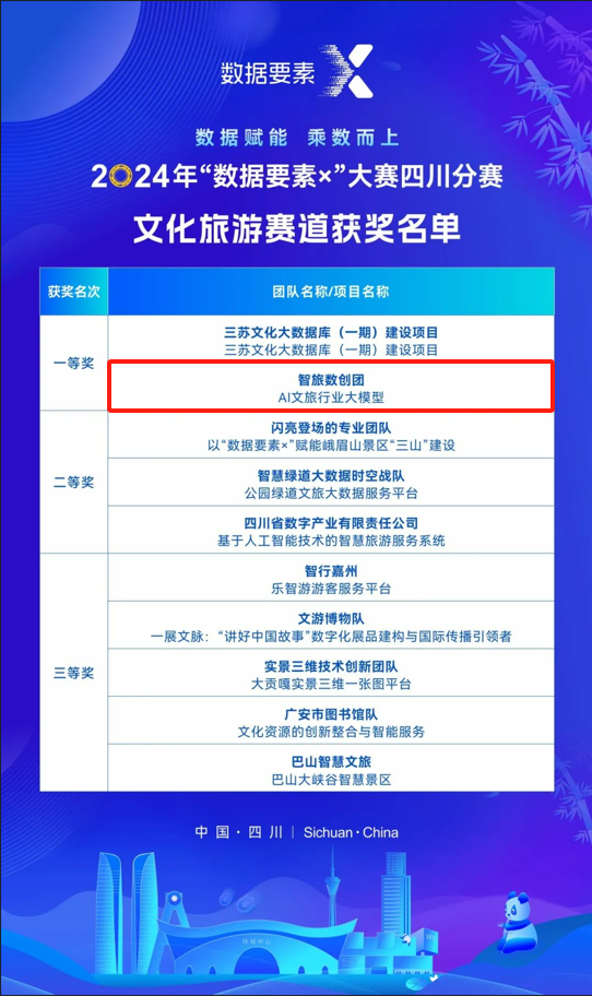 本次大赛中,智胜集成的智旅数创团凭借其研发的“AI文旅行业大模型”项目,荣获“数据要素×”文化旅游赛道一等奖,后续将代表四川征战全国总决赛。