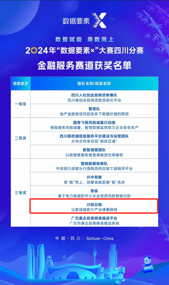 9月23日,由国家数据局、四川省人民政府指导,省发展改革委(省数据局)等单位共同主办的2024年“数据要素×”大赛四川分赛总决赛在达州举行。川投信产所属智胜集成、川投云链经过激烈角逐,从245支队伍中脱颖而出,两个项目最终斩获文化旅游赛道一等奖、金融服务赛道三等奖。