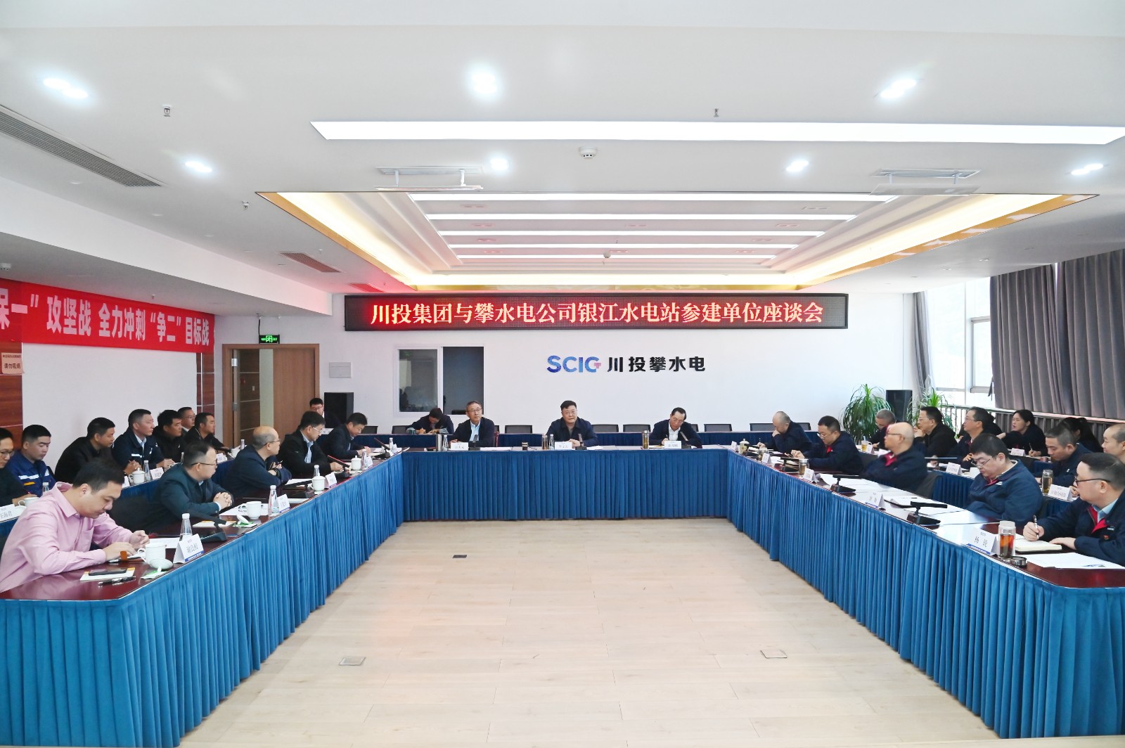 长江设计集团高级咨询、银江项目总工汪庆元,水电五局党委委员、副总经理李法海,贵阳院/监理公司党总支书记、副总经理石志勇,水电十四局建筑工程公司副总经理王建平,广东源天西南公司党支部书记、总经理谢良校;川投能源副总经理、攀水电公司党总支书记、董事长徐孝刚及相关人员参加。
