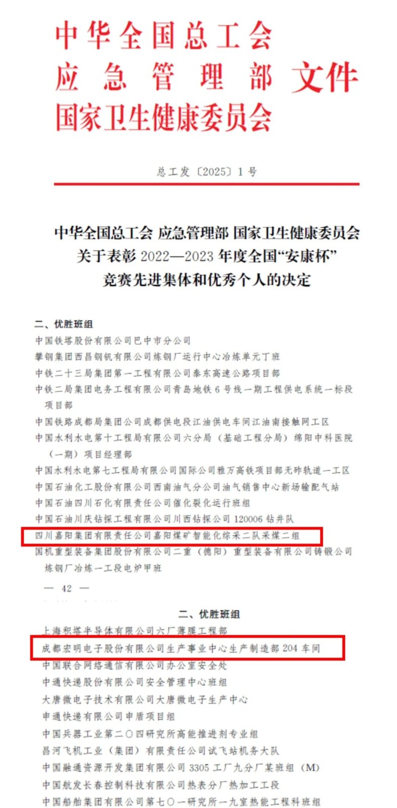 近日,中华全国总工会、应急管理部、国家卫生健康委员会联合发布了《关于表彰2022-2023年度全国“安康杯”竞赛先进集体和优秀个人的决定》,川投集团所属嘉阳集团嘉阳煤矿智能化综采二队采煤二组和川投信产宏明电子生产事业中心生产制造部204车间榜上有名,分别获评全国“安康杯”竞赛优胜班组。