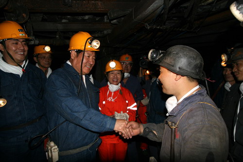 赵铁锤局长、黄彦蓉副省长一行,来到嘉阳集团天锡矿井,听取了嘉阳集团基本情况介绍后,下到矿下观看了井底皮带运输机,察看了32021采煤工作面的支护和煤层情况,向职工询问了矿井采煤工作的基本情况、职工劳动强度和井下作业的相关管理规定等。赵局长一行与职工亲切交谈,谆谆嘱咐他们要搞好安全生产工作,关爱之情溢于言表。