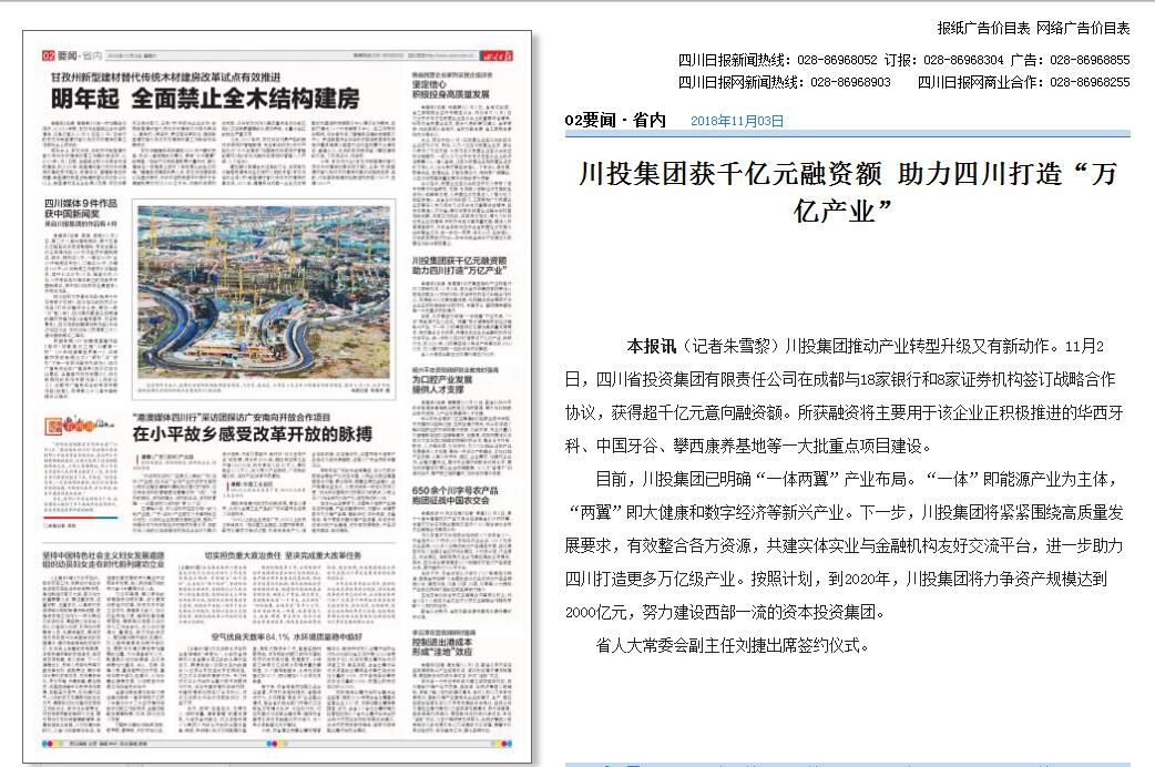 目前,川投集团已明确“一体两翼”产业布局。“一体”即能源产业为主体,“两翼”即大健康和数字经济等新兴产业。下一步,川投集团将紧紧围绕高质量发展要求,有效整合各方资源,共建实体实业与金融机构友好交流平台,进一步助力四川打造更多万亿级产业。按照计划,到2020年,川投集团将力争资产规模达到2000亿元,努力建设西部一流的资本投资集团。