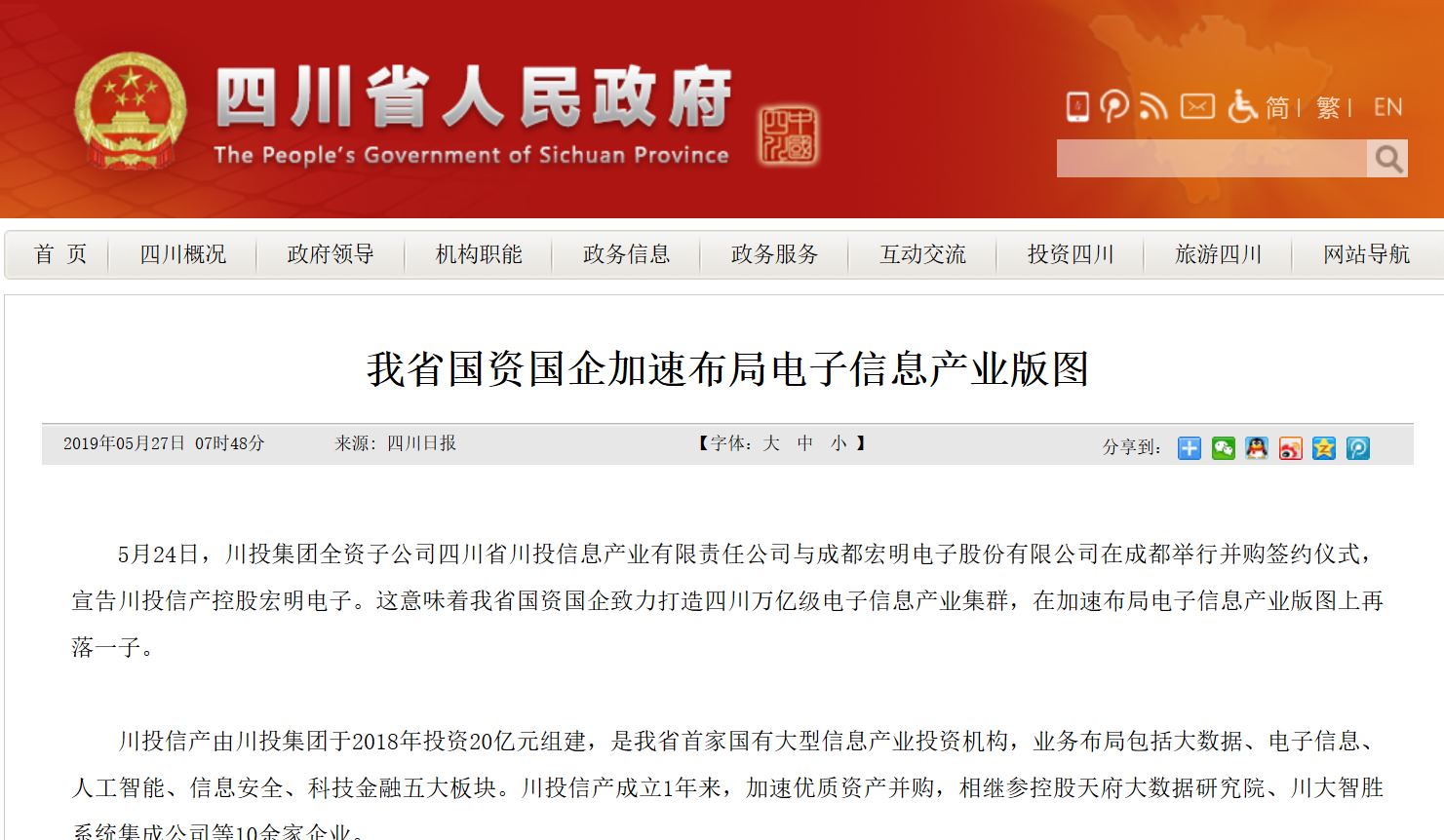 5月24日,川投集团全资子公司四川省川投信息产业有限责任公司与成都宏明电子股份有限公司在成都举行并购签约仪式,宣告川投信产控股宏明电子。这意味着我省国资国企致力打造四川万亿级电子信息产业集群,在加速布局电子信息产业版图上再落一子。
