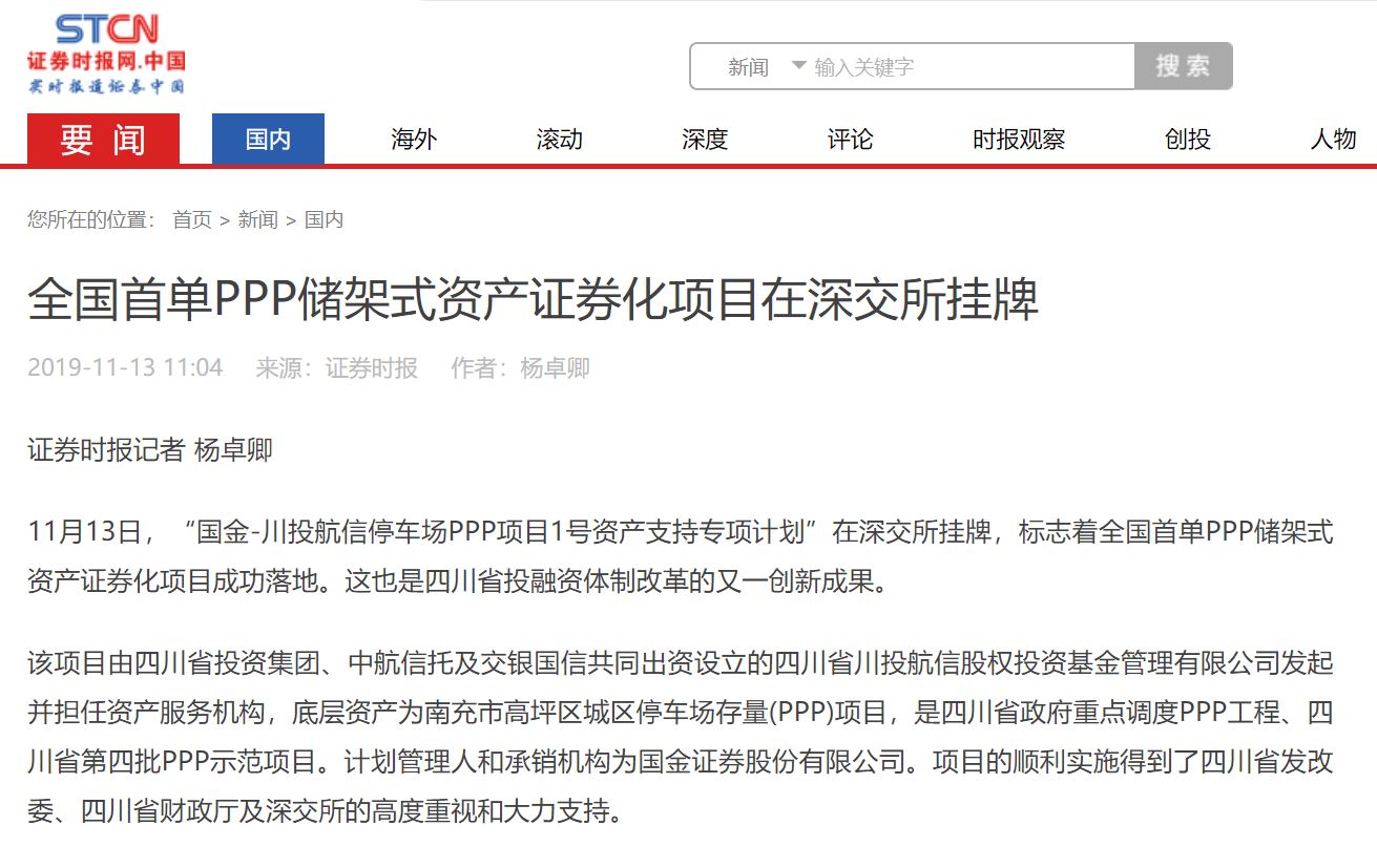 11月13日,“国金-川投航信停车场PPP项目1号资产支持专项计划”在深交所挂牌,标志着全国首单PPP储架式资产证券化项目成功落地。这也是四川省投融资体制改革的又一创新成果。