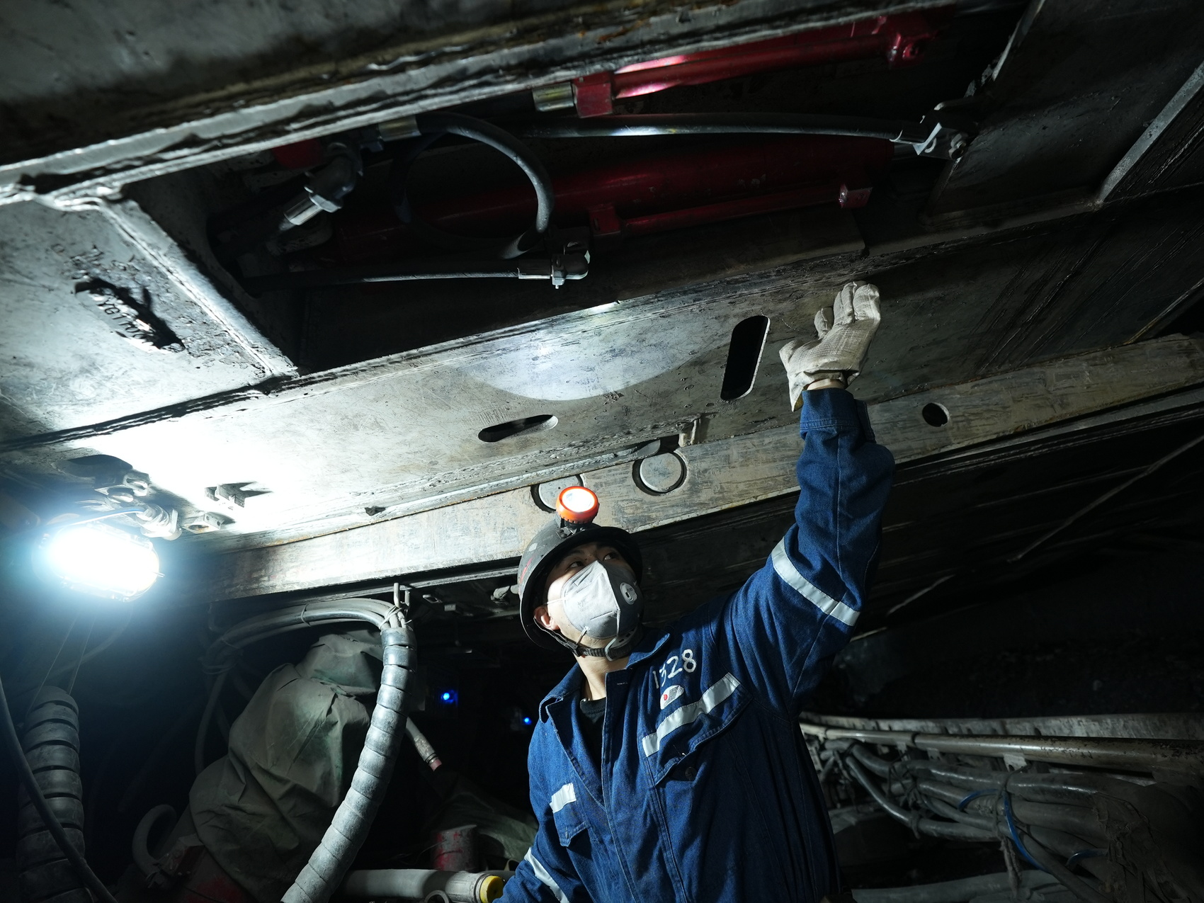 在嘉阳煤矿1205智能化综采工作面,支架巡护员肖红强正在查看支架安全。
