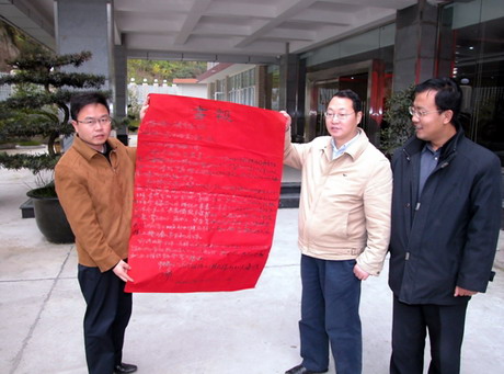 理张邦全(左二)从中铁十六局田湾河项目部经理李树浩(右一)手中接过喜报
