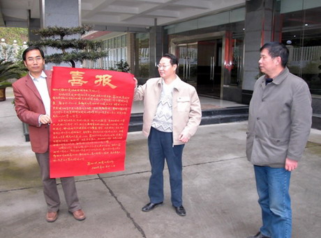 (左二)从葛洲坝项目部经理刘勇(右一)手中接过喜报。