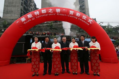 2007年11月9日上午,嘉阳集团矿区火车站人山人海、热闹异常,小火车披红挂彩,客车厢贴上了“莱斯特郡之骄”铭牌,汽笛声声、鼓乐阵阵、掌声不断,嘉阳小火车“莱斯特郡之骄”剪彩仪式在这里隆重举行,矿区数千职工家属和省市各大媒体共同见证了这一庄严时刻。