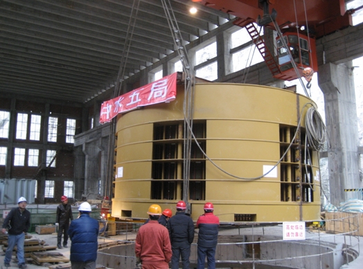 2008年1月20日11:58时,金窝水电站2#水轮发电机定子一次性成功吊入机坑。