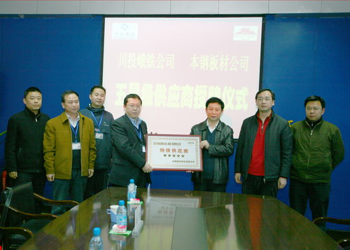 近日,本钢板材股份有限公司供应处副处长于天刚、合金科副科长赵明辉专程前往川投峨铁公司授予“2007年特级供应商”牌匾。
