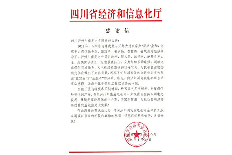 省经信厅来信中道:2023年,四川省迎峰度夏与成都大运会举办“双期”叠加,电煤电力保供任务重、困难多、要求高。在省委、省政府的坚强领导下,川南发电公司讲政治、顾大局、敢担当,统筹各方力量,落实保供责任,组建最强队伍,全力组织采购电煤,超额完成保供目标任务,火电机组长期保持顶峰发力,为省能源安全稳定供应做出了突出贡献,展现了川南发电公司作为省内能源“稳定器”和“压舱石”的风采。特向川南发电公司表示衷心感谢!并向全体干部员工致以诚挚的问候。
