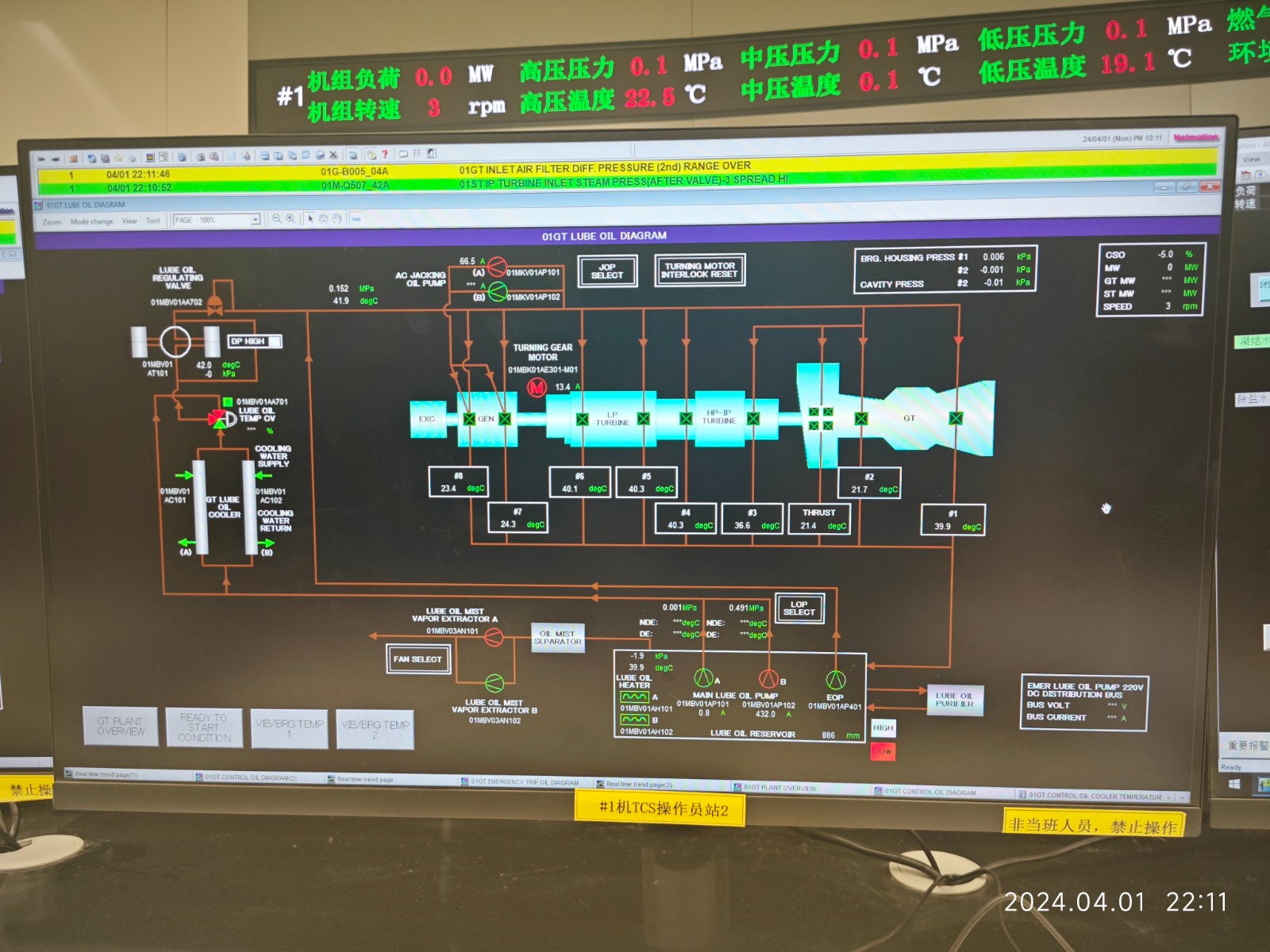 盘车投运前,参建各单位汽机、电仪、调试相关专业人员按照施工、调试方案逐一检查盘车条件,确认机组轴系连接工作已完成、润滑油系统调试完毕并取得油质合格报告、顶轴油系统调试完成、TCS监控画面正常投用。盘车运行后,相关人员又对各项运行参数进行了详细的检查、检测,确认燃机、汽轮机、发电机轴系各部件运行状态正常。