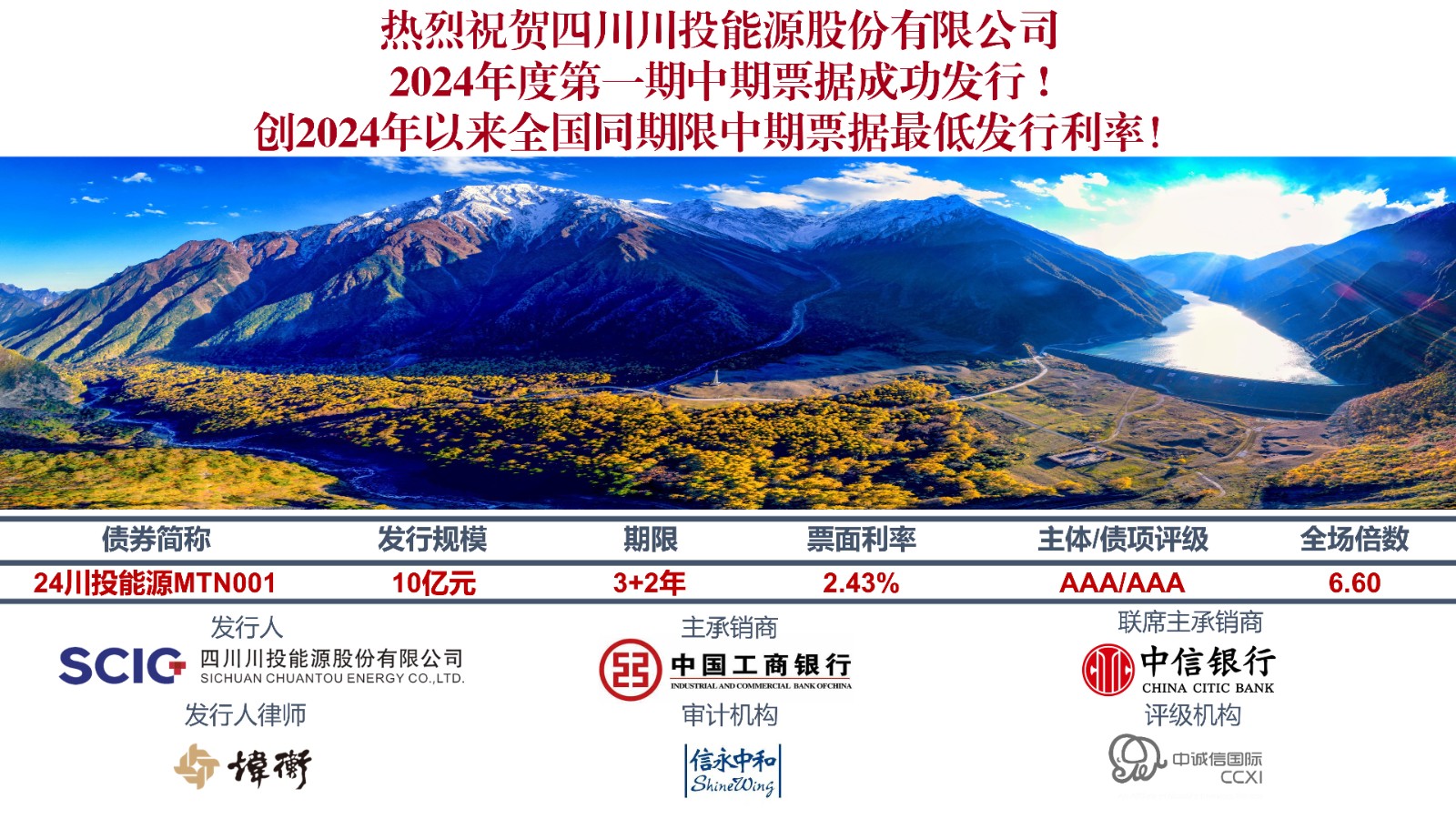 4月16日,川投能源抢抓资本市场有利时间窗口,成功发行2024年度第一期中期票据。本期中期票据发行规模为10亿元,发行期限3+2年,发行利率2.43%,创2024年以来全国同期限中期票据最低发行利率,同时也创公司中长期债券历史最低发行利率。