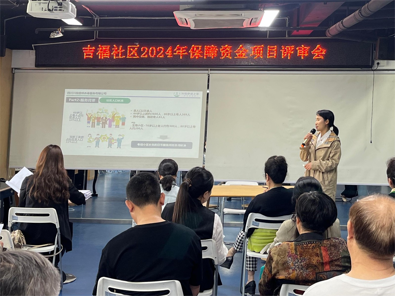 评审会上,川投盛榉公司授权代表结合吉福社区人口状况、长者需求精准匹配服务内容,以“福星聚拢”(队伍组建、专业培育)“福进万家”(走访慰问、服务内容明确)“福伴银龄”(机制建立、特色服务实施)三步骤为吉福社区老龄群体提供专业化、品质化、个性化晚年服务,携手社会志愿者资源营造有活力、有动力、有温情的多彩社区友好氛围。