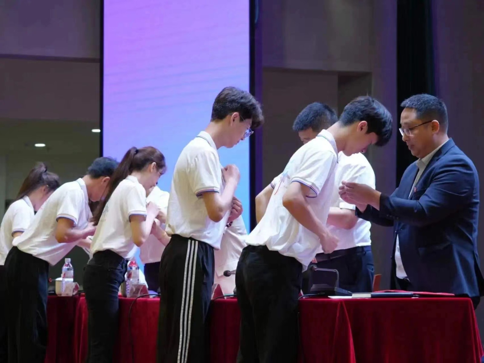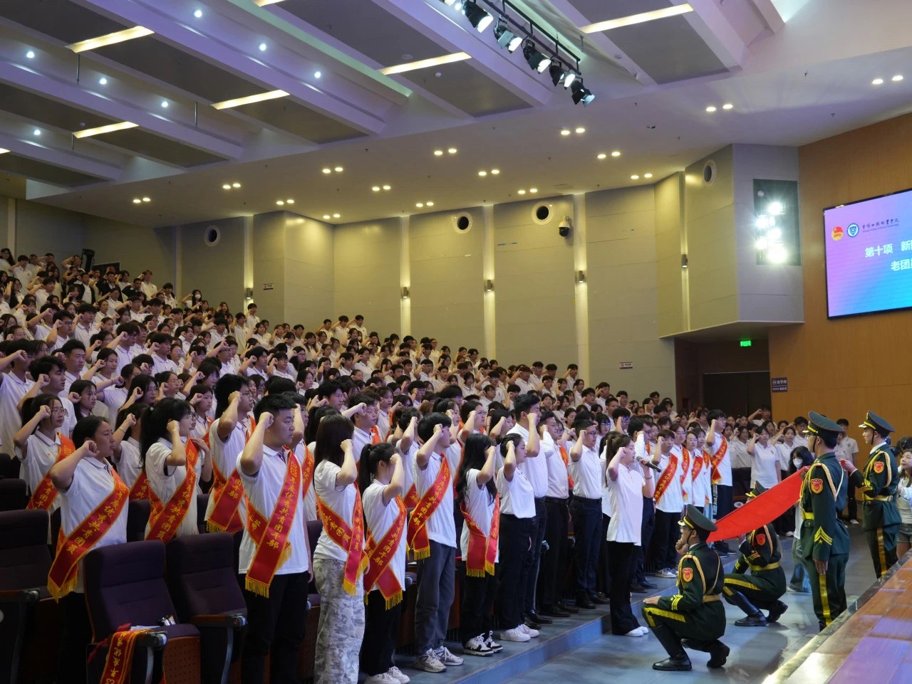 入团仪式上,学生工作部部长许宏君宣读《2024年上半年新团员入团名单》,与会领导为新团员佩戴团徽、颁发团员证。全体新老团员庄严宣誓。