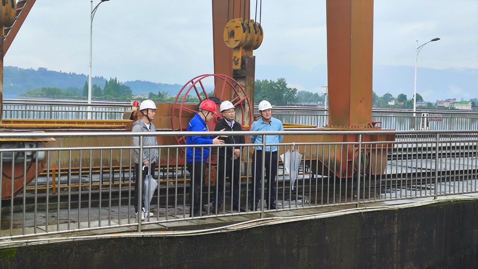 杨传华一行实地察看电厂前池库区、大坝、泄洪冲沙闸等工程,对防汛工作落实情况、应急预案修订、监测预警与联动、应急物资储备工作情况进行检查,并现场听取电厂防汛抗旱责任落实、水库调度管理、极端天气防范应对措施等工作情况的汇报。