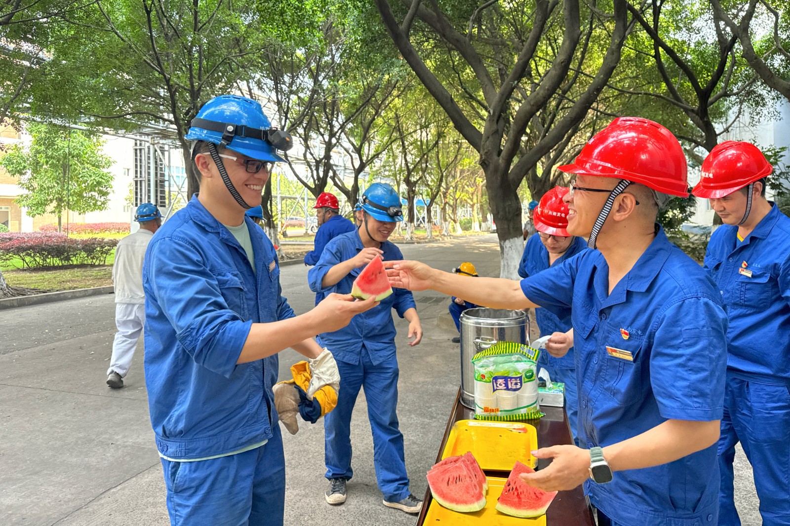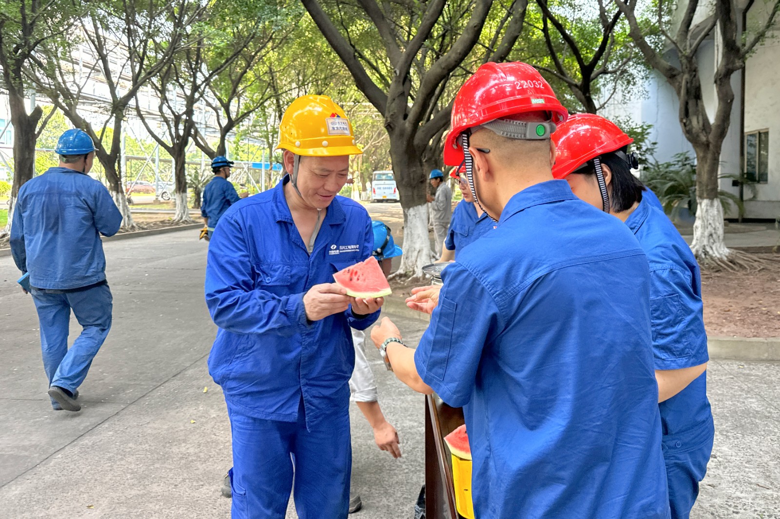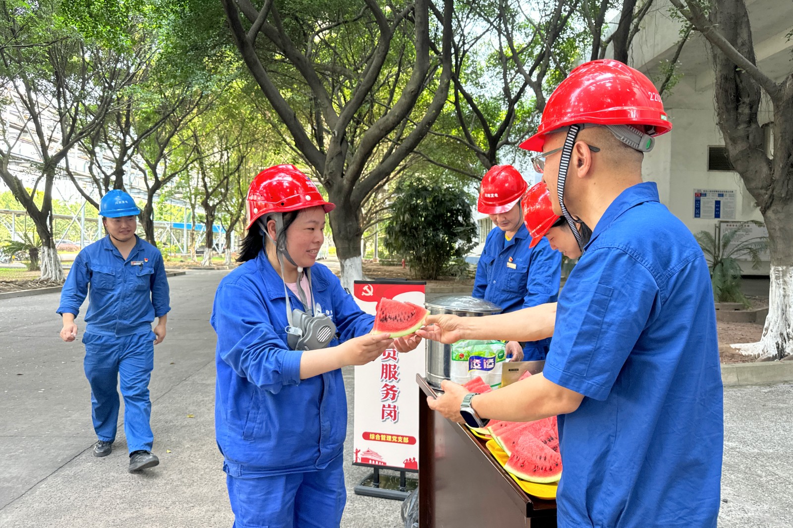 5月24日,连续多日的晴热高温下,川南发电公司综合管理党支部开展“战高温、送清凉”党员服务活动,为检修现场作业人员送去西瓜和防暑降温饮品,助力迎峰度夏机组检修工作。