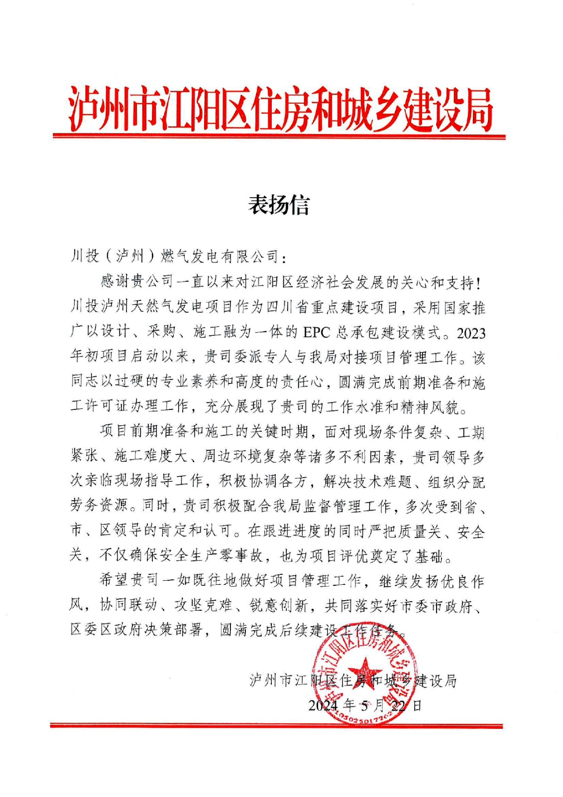 5月23日,泸州市江阳区住房和城乡建设局副局长李元均一行到川投泸州天然气发电项目督导项目建设工作并向公司送上了表扬信。