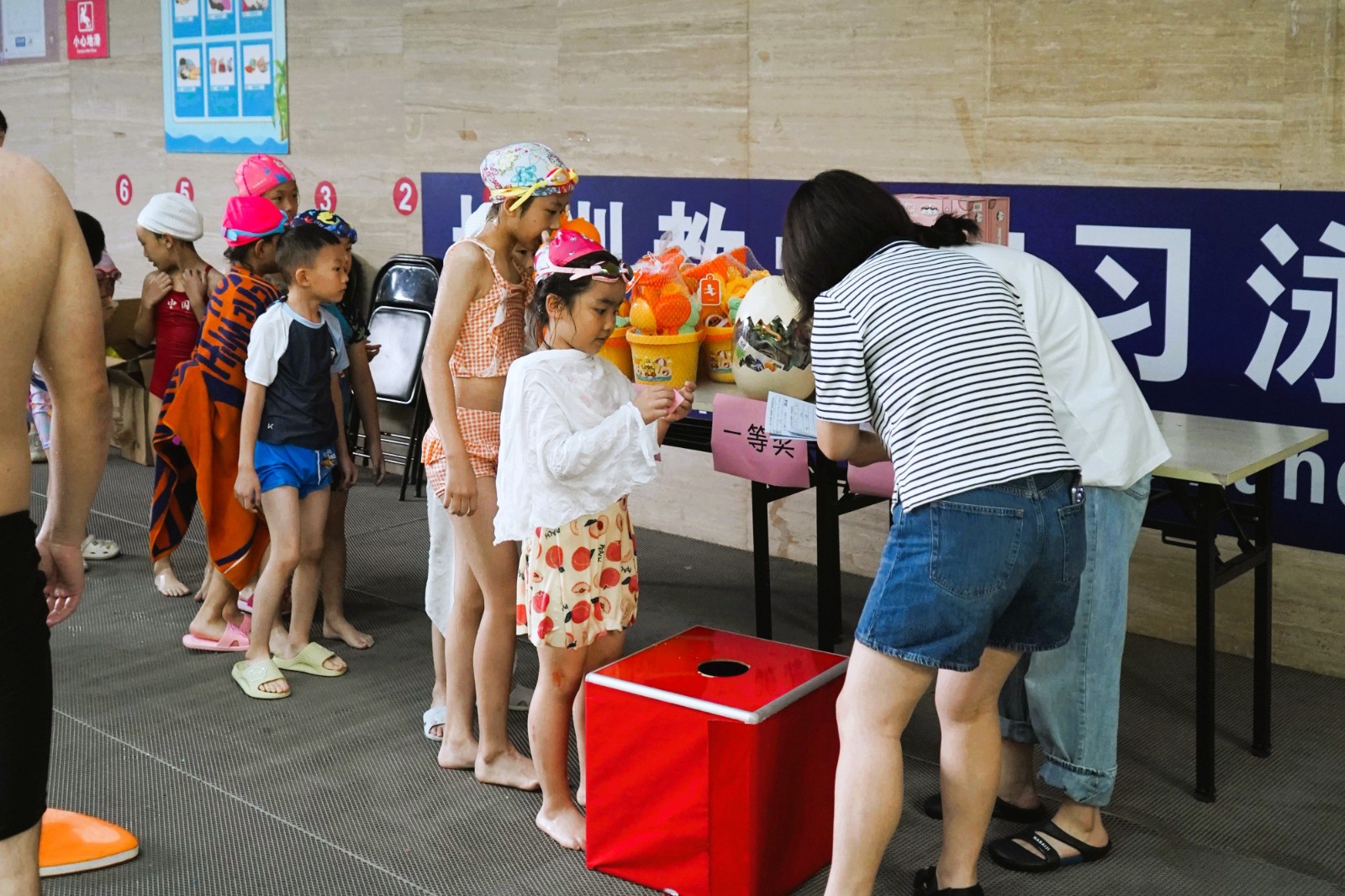 活动现场,孩子们认真乖巧做着热身运动,身体得到了充分舒展,在场馆部游泳教练的带领下进行呼吸换气和蛙泳动作的岸上基础学习。经过一番收、蹬、翻、夹动作练习后,有经验的孩子们迫不及待的跳进泳池,感受水中的清凉,自如地在水里游动;初次游泳的孩子们则继续在岸边练习呼气蹬腿,在教练和家长的不断鼓励下也大胆地尝试进入泳池游了起来。进入抽奖环节时,孩子们激动万分,家长们期待满满,最终参与活动的每一位小朋友都收到了工会精心准备的节日礼物,现场欢笑声此起彼伏,气氛温暖而热烈。