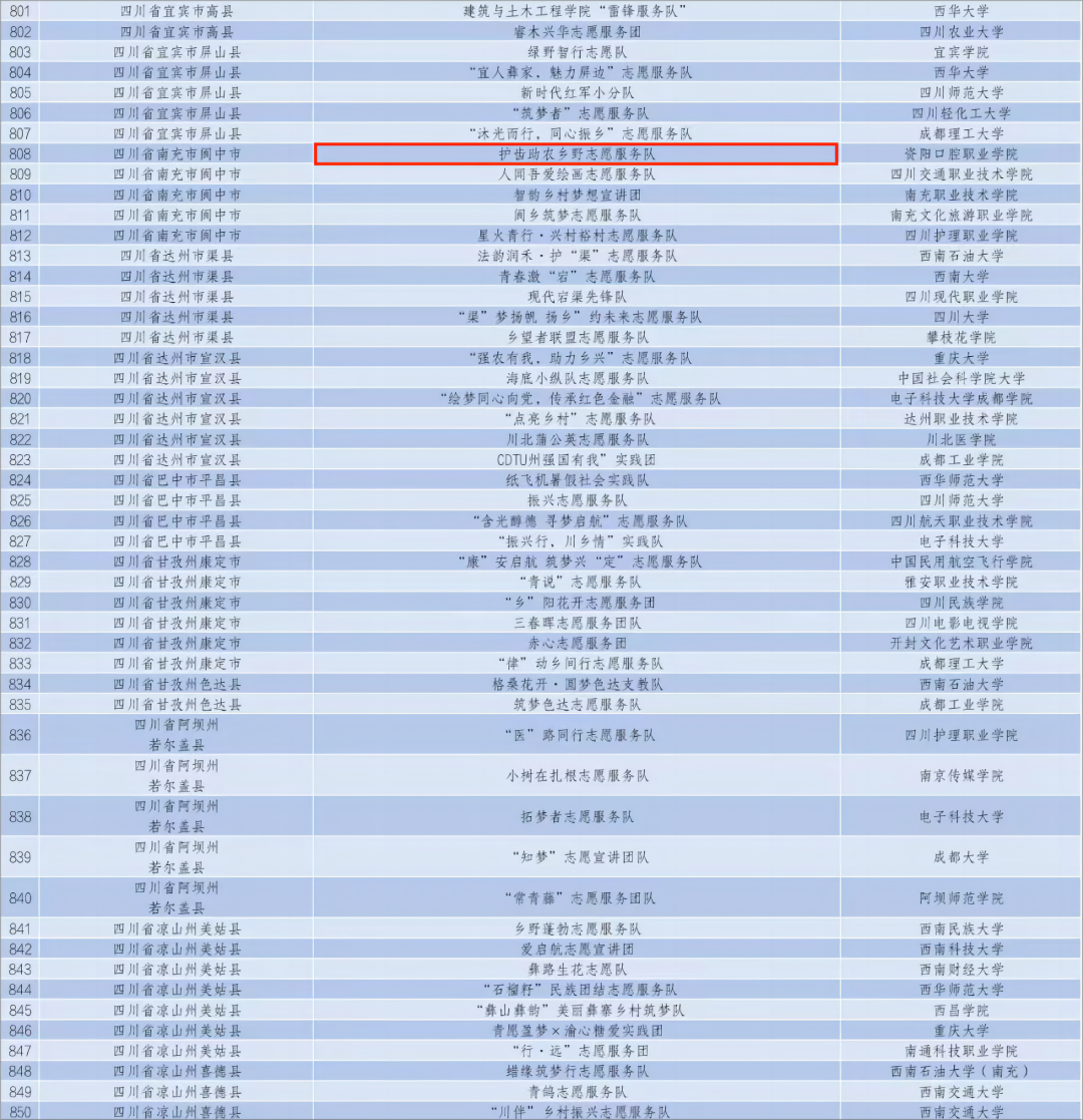 为深入学习宣传贯彻习近平新时代中国特色社会主义思想和党的二十大精神,服务全面推进乡村振兴,动员引导青年学生投身乡村振兴一线,中国农业发展银行、团中央青年志愿者行动指导中心联合发布《关于遴选2024年全国大学生“乡村振兴”志愿服务团的公告》。 5月28日,中国青年志愿者协会公布了2024年全国大学生志愿服务团队入选名单。其中,资阳口腔职业学院"护齿助农乡野志愿服务团队"与来自南京航空航天大学、华中科技大学、吉林大学、四川大学等748所高校的1000支大学生志愿服务团队共同入选。