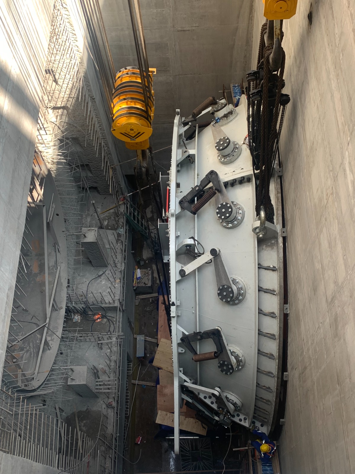 导水机构是控制银江水电站机组流量的重要部件,对机组运行整体稳定性和安全性至关重要。其总重量256.8吨,外配水环上游法兰面最大直径为11.8米,内配水环上游法兰面最大直径为5.6米。因导水机构尺寸大、重量大、施工场地受限,导致导水机构整体翻身非常困难,前期在总体方案设计时,明确提出在外配水环-Y方向的两侧安装两个翻身靴,确保导水机构平稳翻身。攀水电公司提前组织相关参建单位召开导水机构安装危大工程专项施工方案评审会,详细讨论了吊装各环节注意事项,并提前部署安排相关准备工作。