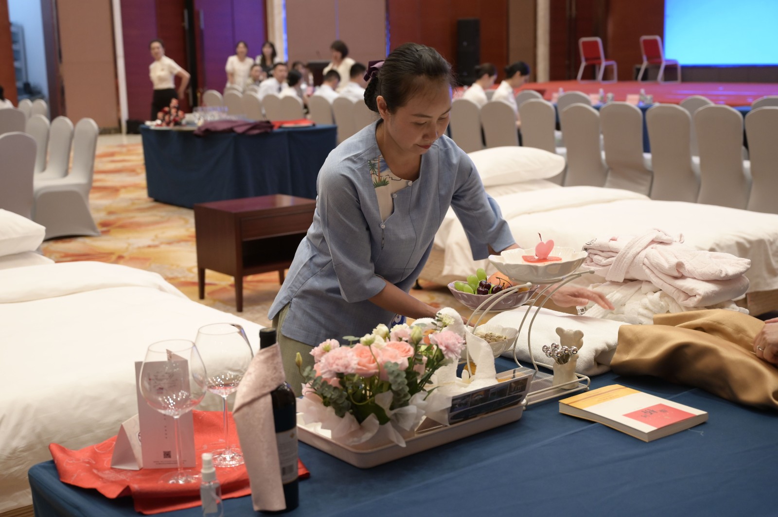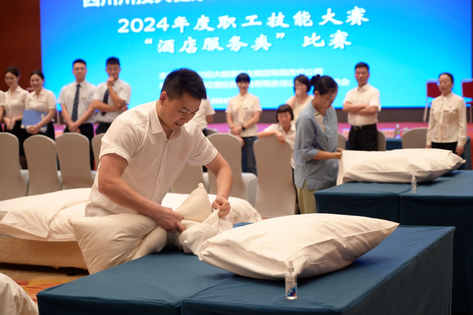 大赛设置中式铺床、中餐摆台、西餐摆台、会务摆台4个项目的个人赛和酒店服务礼仪团体赛,共计5个比赛项目。来自川投国网工会、红投公司工会的30名职工参加比赛。经过近8个小时的技能角逐,个人赛项目4个项目中的12名参赛选手斩获奖项,比赛全程紧张有序,参赛选手们在比赛中展示出的娴熟技艺和专业操作赢得了现场观众的热烈掌声。