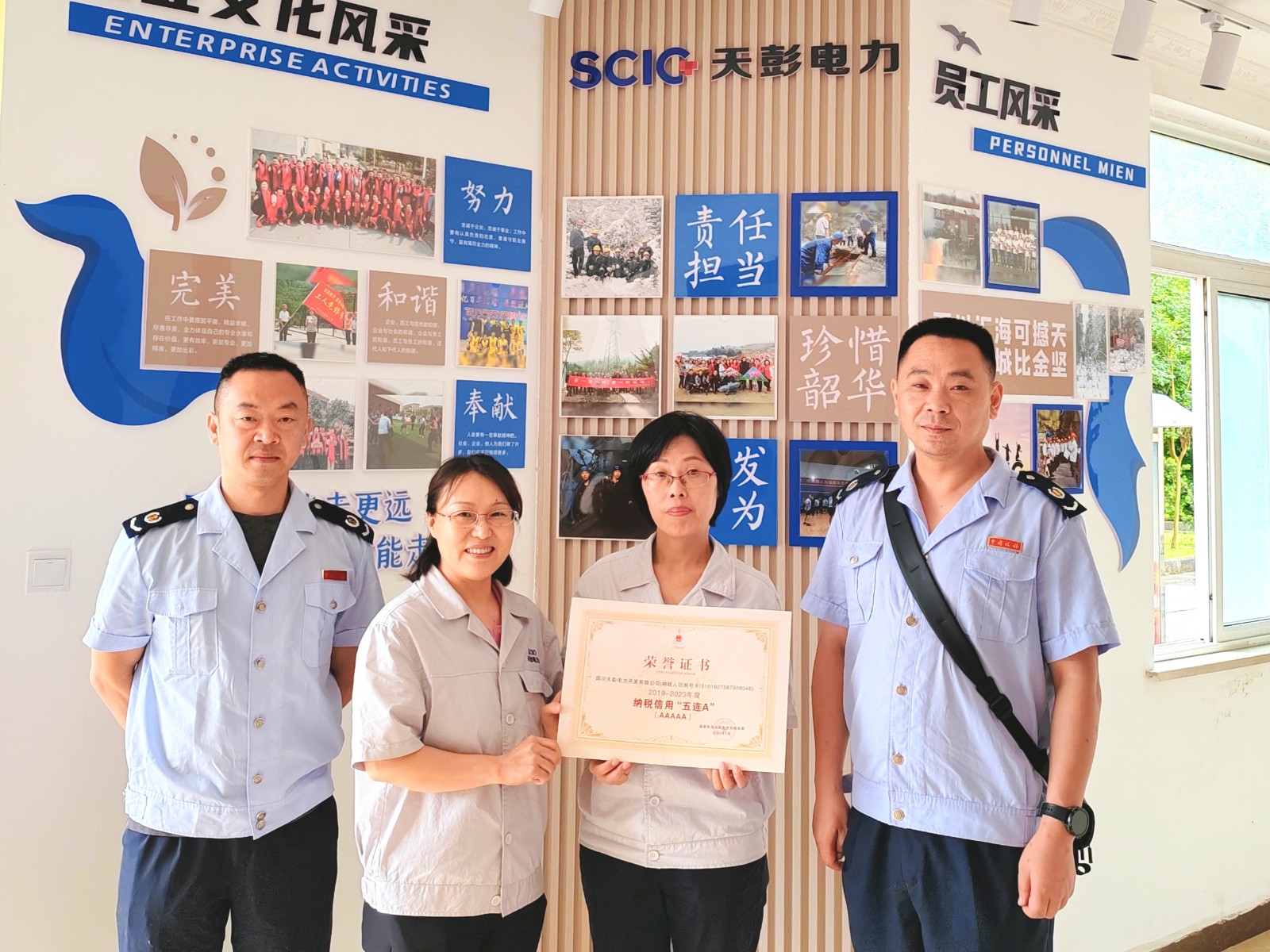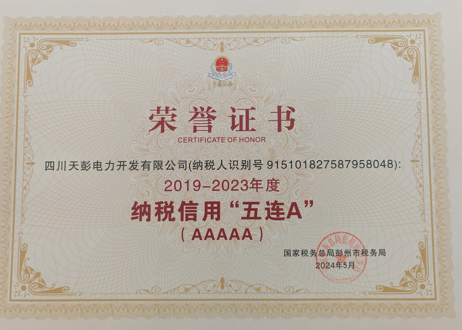 6月11日,川投能源所属天彭电力公司喜获殊荣:国家税务总局彭州市税务局向我公司授予了“彭州市‘2019-2023年度纳税信用五连A’”荣誉证书,这是税务机关对我公司诚信纳税、守法经营的肯定和表彰。