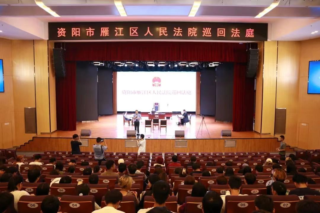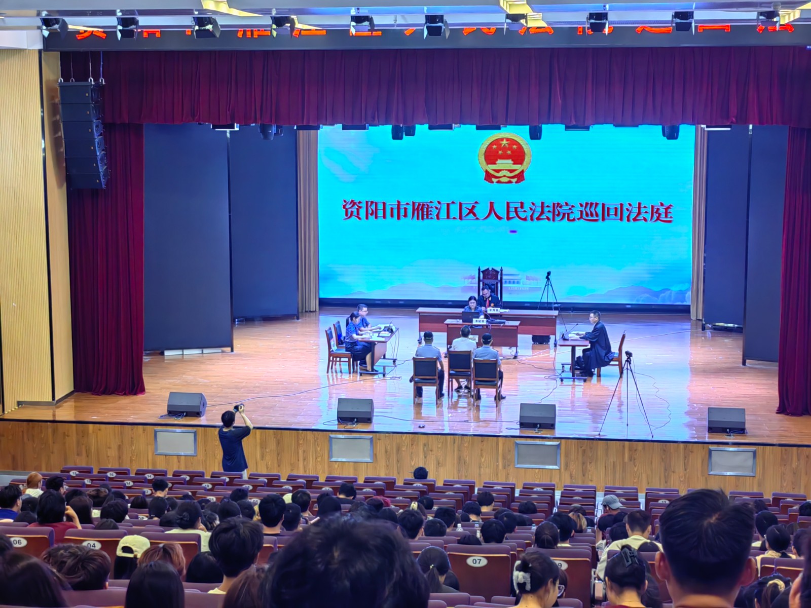 为扎实推进校园法治宣传工作,让广大学生了解法律,增强法律意识和安全意识,6月18日,学院联合资阳市雁江区人民法院、资阳市雁江区检察院,将一起容留他人吸毒的刑事诉讼案件“搬到”校园,变严肃“庭审现场”为“普法课堂”,百余名师生代表“沉浸式”旁听庭审,一键开启“零距离”普法。