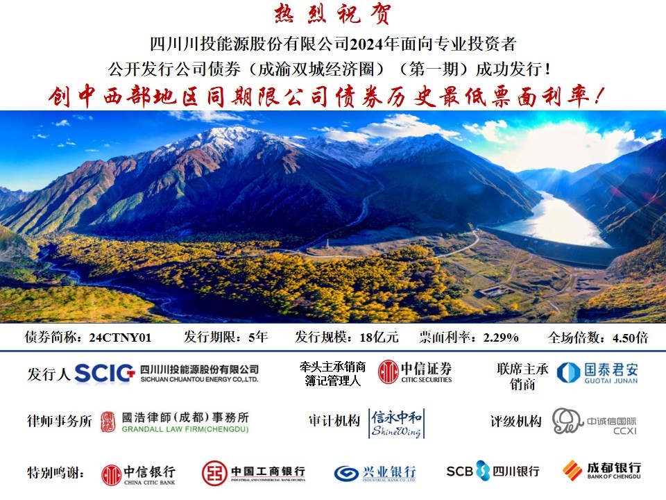 7月10日,川投能源2024年面向专业投资者公开发行公司债券(成渝地区双城经济圈)(第一期)成功发行。本期公司债券发行规模18亿元,期限5年,票面利率2.29%,创中西部地区同期限公司债券历史最低发行票面利率。