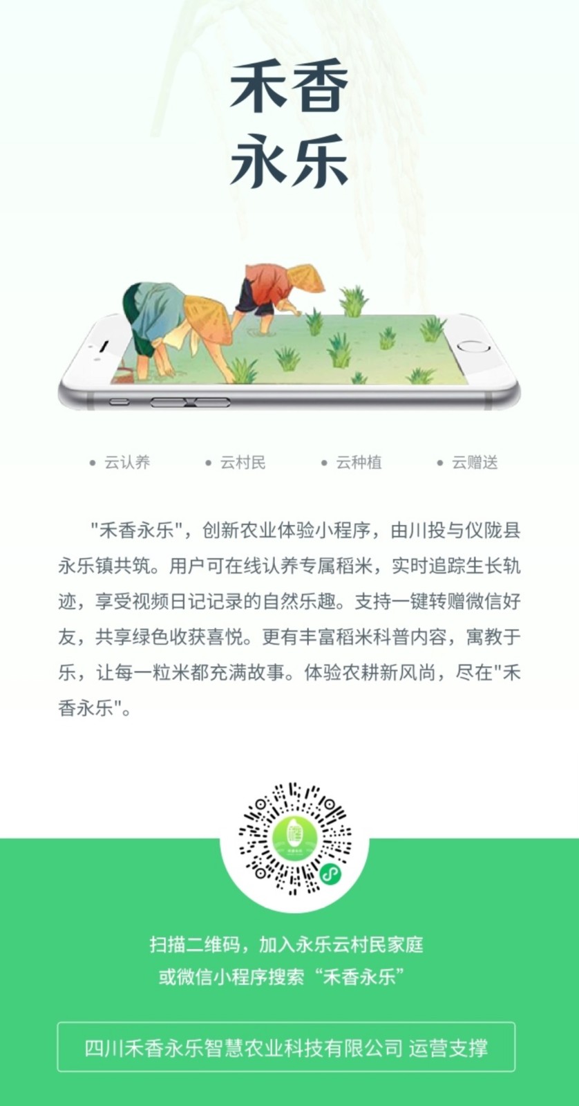 本次上线的“禾香永乐”川投永乐云农场小程序,涵盖农产品认养、线上电商、农事记录、作物长势日志、稻米科普等多元化功能。消费者仅需轻点手机屏幕,即可参与水稻田的在线认养,享受从田间到餐桌的全程可视化追溯服务。此外,小程序还提供了丰富的互动体验,认养者不仅能实时查看作物生长情况,更可亲自前往体验农耕乐趣,感受大自然的宁静与美好。