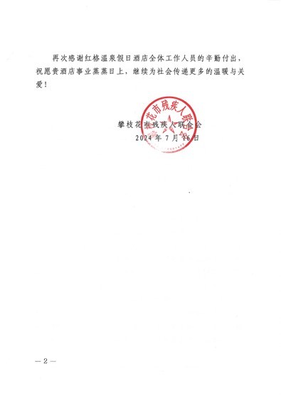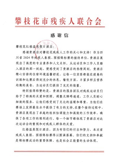 7月16日,红投公司红格温泉假日酒店荣幸地收到了来自攀枝花市残疾人联合会的一封感谢信,信中就酒店作为四川省2024年残疾人象棋、围棋锦标赛接待单位,接待中提供的无障碍服务给予了高度评价和诚挚感谢。