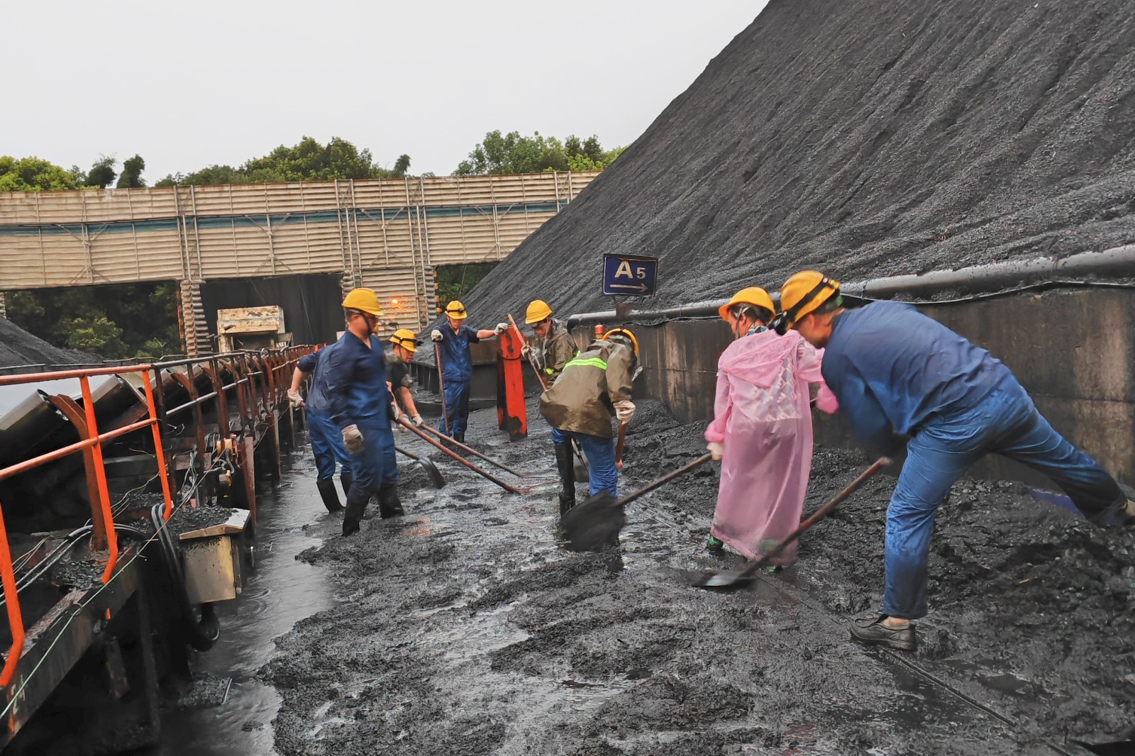 当日,随着泸州气象台紧急发布暴雨橙色预警信号,预示着严峻的天气考验即将来临。傍晚时分,江北镇遭遇了历史罕见的特大暴雨,累计降雨量高达144.4毫米,短时内更是达到了90.7毫米/小时,这对公司的露天储煤场构成了前所未有的威胁。面对这一紧急情况,储煤场内的煤堆在暴雨的猛烈冲刷下发生自流,煤流越过挡煤墙,掩埋斗轮机的行走轨道,各煤场出入口也出现煤流漫过封堵沙袋的情况。