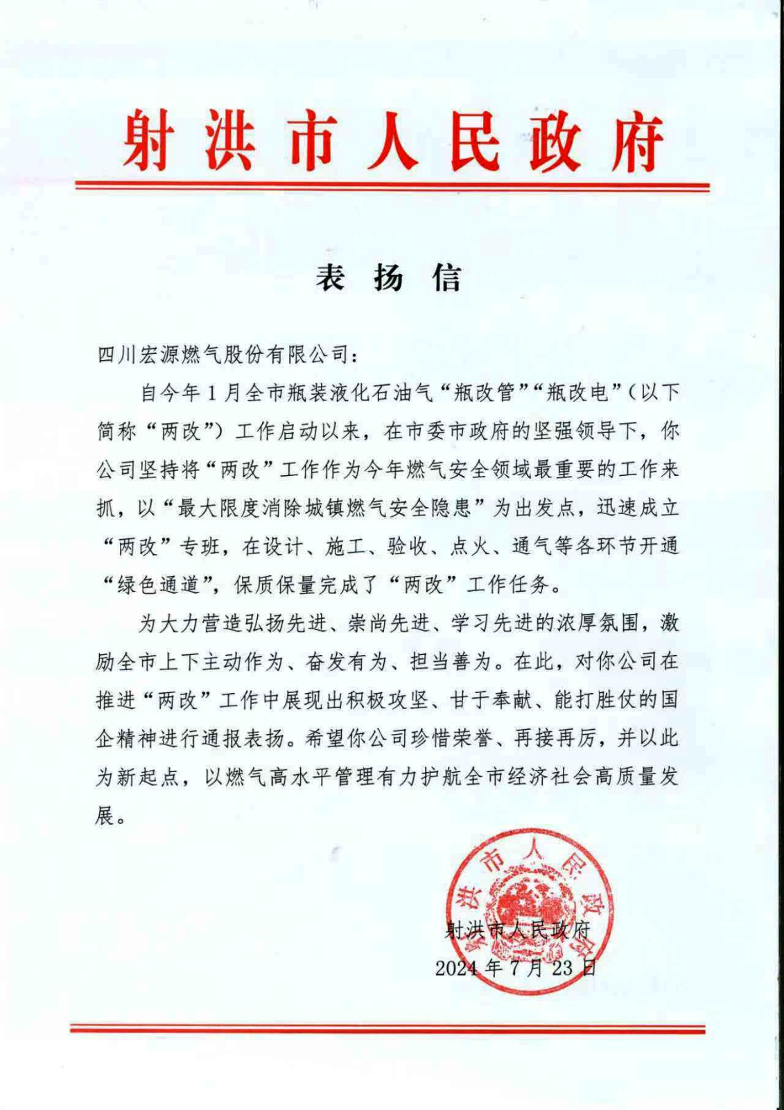 7月24日上午,宏源气司因攻坚克难、保质保量完成瓶装液化气“瓶改管”工作任务受到射洪市人民政府通报表扬。表扬信中对宏源气司在推进“两改”工作中所展现出的积极攻坚、甘于奉献、能打胜仗的国企精神和为射洪市经济社会发展做出的重要贡献给予了充分肯定。