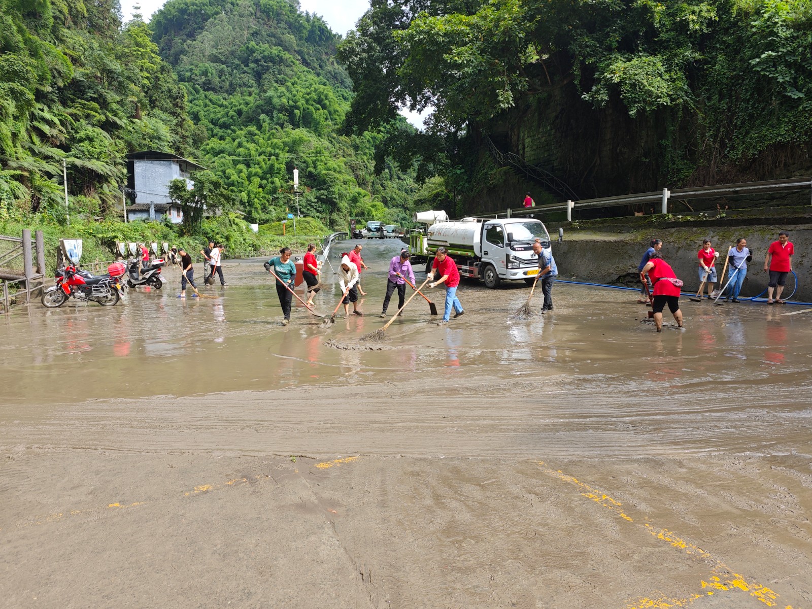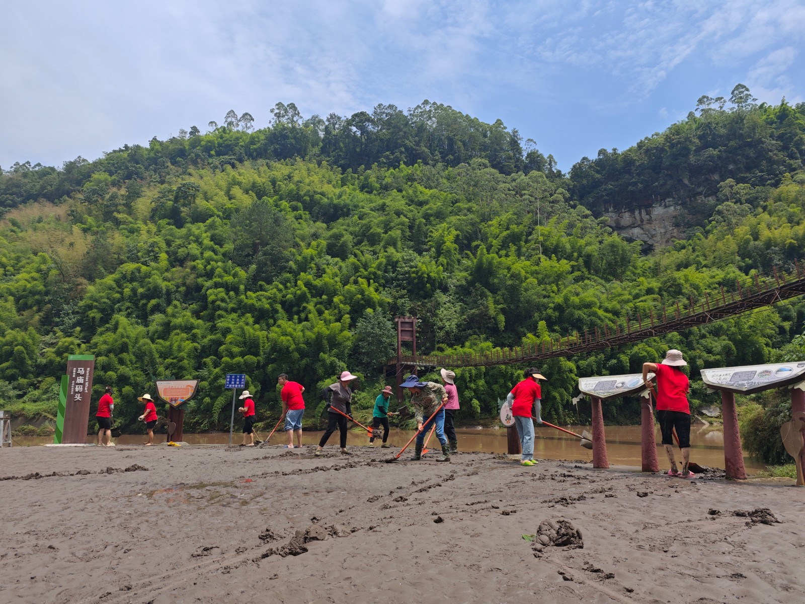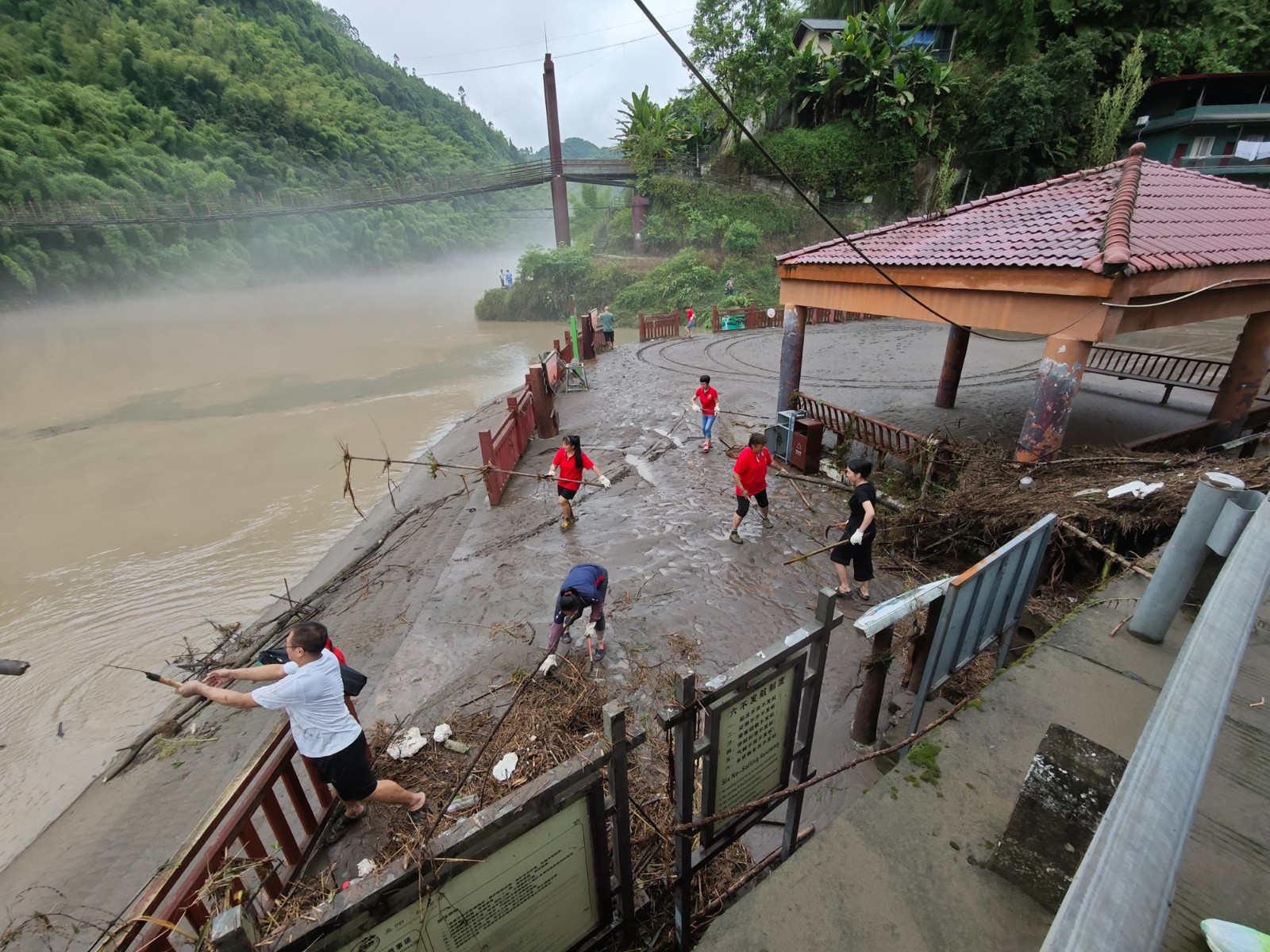 7月25日,马边河水逐渐退去,党员、职工立即行动起来,顶着炎炎烈日、冒着高温酷暑,党员、职工们一边用水冲,一边用铲刮,相互配合协同作战,衣服干了又湿湿了又干,却没有一个人叫苦叫累,经过一整天的努力,终于在下午4点将所有淤泥全部清理干净,泥泞的马庙码头恢复往日的美丽、祥和,以崭新姿态迎接游客们的到来。