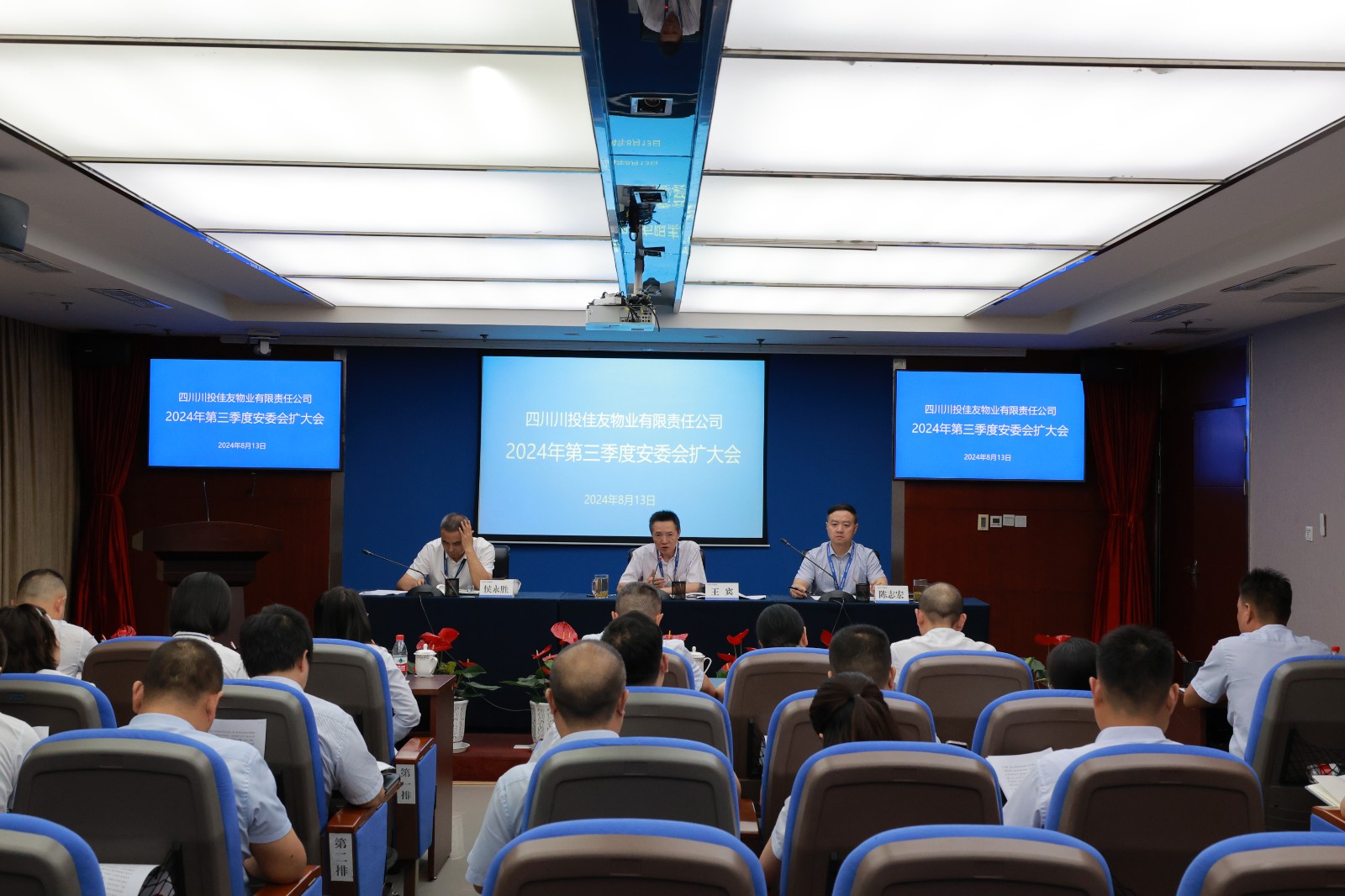 2024年8月13日,四川川投佳友物业有限责任公司召开了2024年三季度安委会扩大会议。会议由支部副书记、总经理、安委会主任陈志宏主持。会上支部委员、副总经理、安委会常务副主任侯永胜组织学习了近期习近平总书记关于安全生产重要指示批示及上级有关会议精神。陈志宏总结了上半年安全生产工作情况并部署了近期安全生产工作。最后党支部书记、董事长王宾做工作部署。