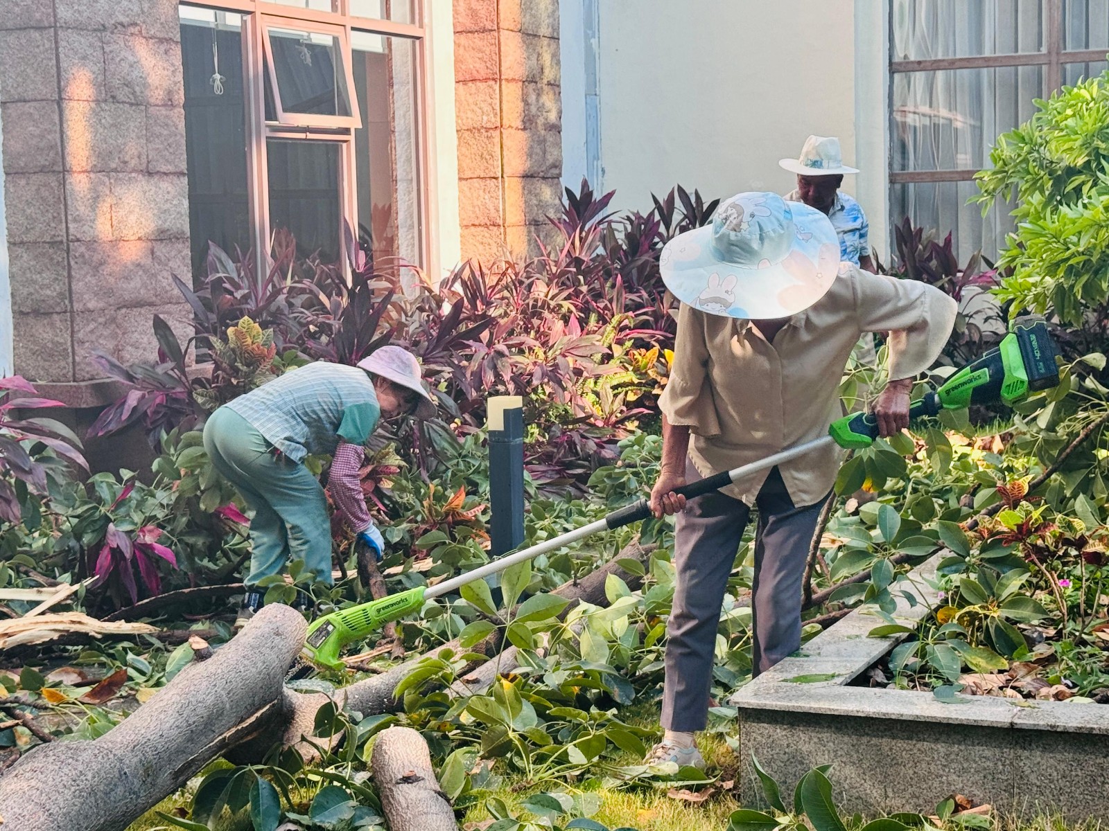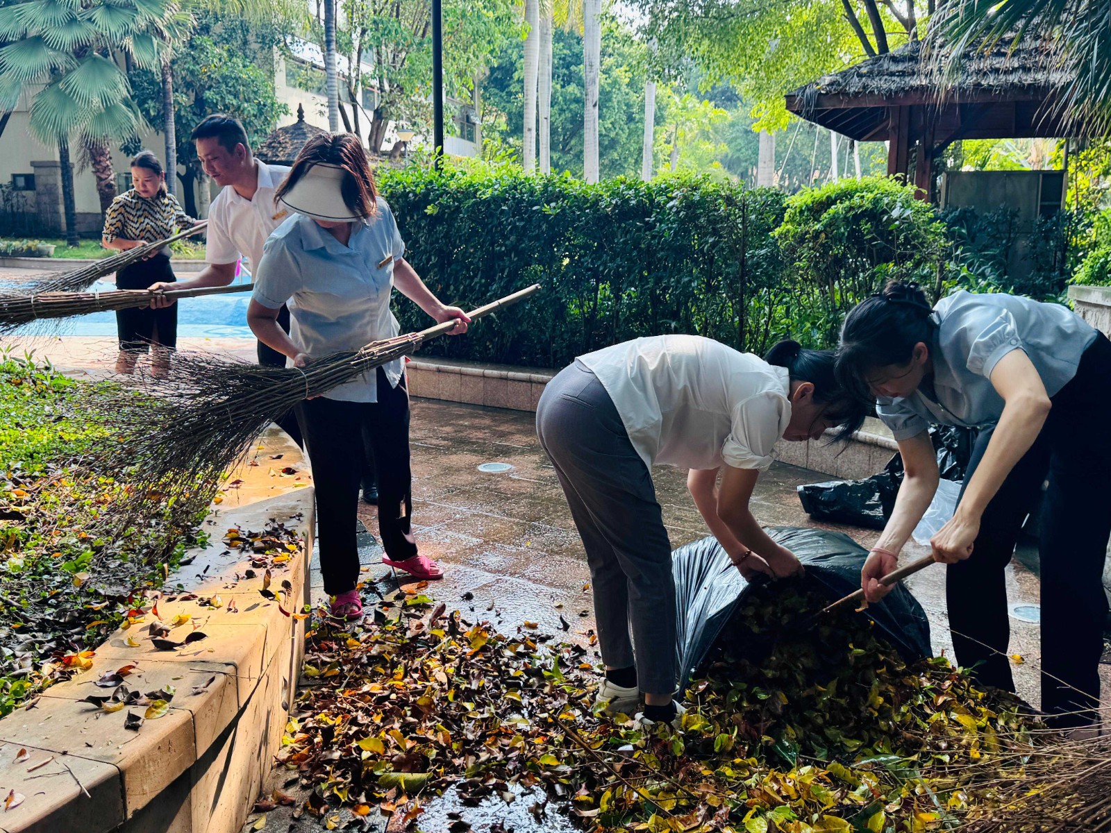 面对狂风暴雨后的杂乱环境,为确保酒店正常经营和宾客的舒适体验,公司党支部副书记、酒店负责人范英迅速组织酒店营销部门及办公室全体人员投入到一线经营区域雨后恢复工作中,清理倒树、疏通道路、消除隐患,及时将杂乱无章的经营区域在当日正式营业前恢复如初。