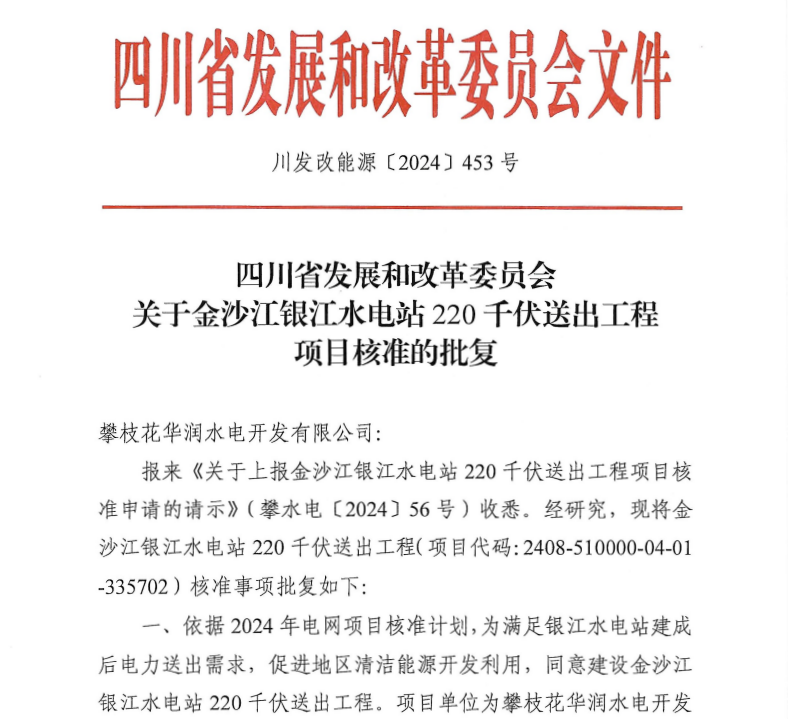 9月6日,川投能源所属金沙江银江水电站220千伏送出工程成功取得四川省发改委核准批复,为顺利实现蓄水发电目标再增“助推器”。