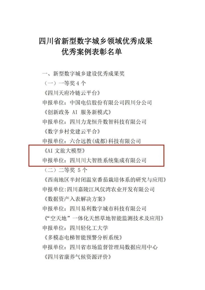 近日,四川省智慧城乡大数据应用研究会联合四川省新型数字城乡领域专家团,公布了新型数字城乡领域优秀成果优秀案例表彰名单,公司所属智胜集成的AI文旅大模型荣获新型数字城乡领域优秀成果一等奖。