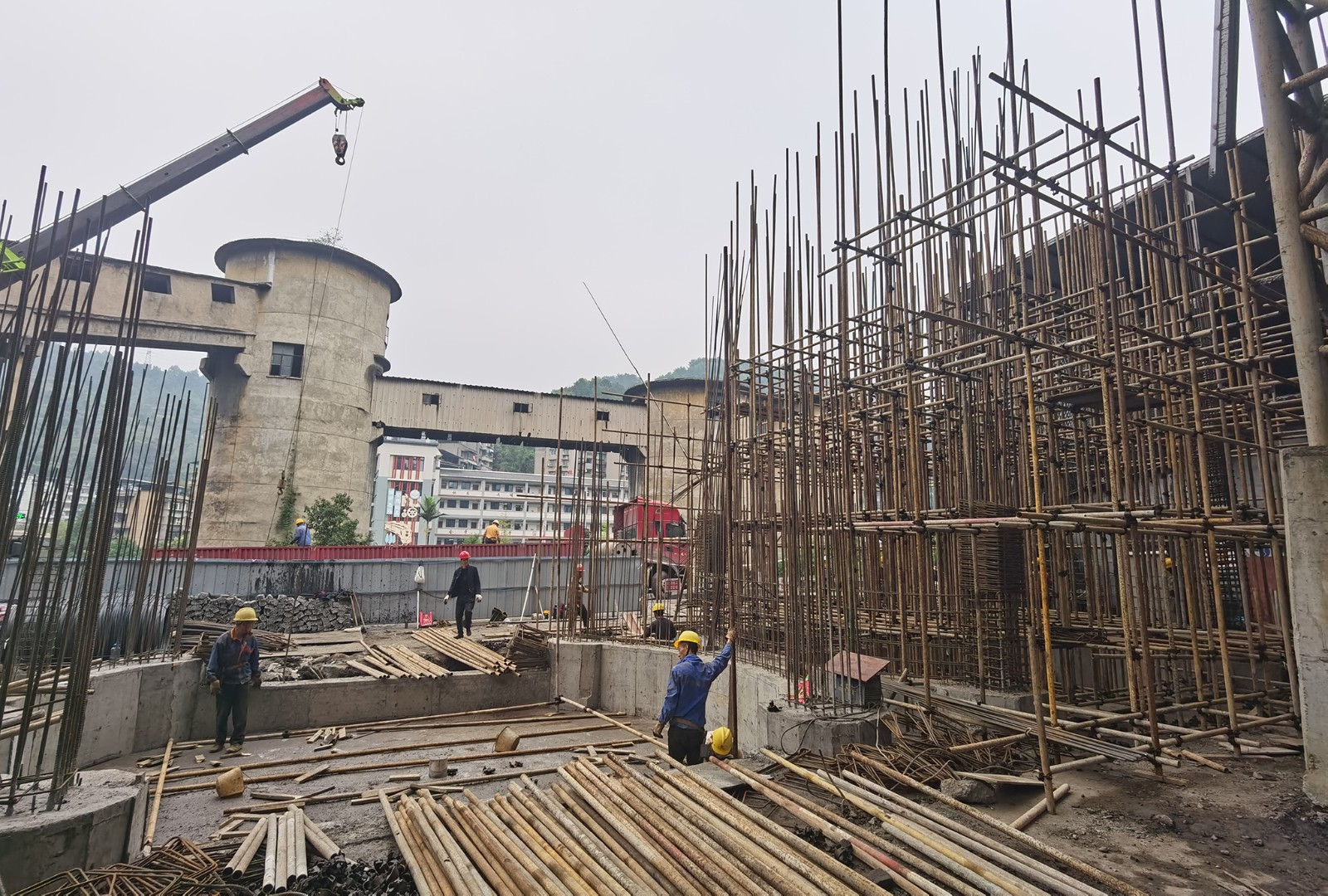 继分级转运系统主体竣工后,配套设施工程建设往外加速推进,主要在嘉阳煤矿炭坝原入口处新建两个储备800吨煤炭的煤仓,工期120天,现已完成两煤仓桩基施工和地梁混凝土浇灌并通过验收。目前,施工人员正按设计搭建脚手架,从两个煤仓的基础向上延伸钢筋,逐渐形成圆形煤仓筒体,为下一步混凝土浇灌作准备。现场,公司现场管理单位紧盯工程进度,做好全过程技安指导与督察,确保工程顺利推进。