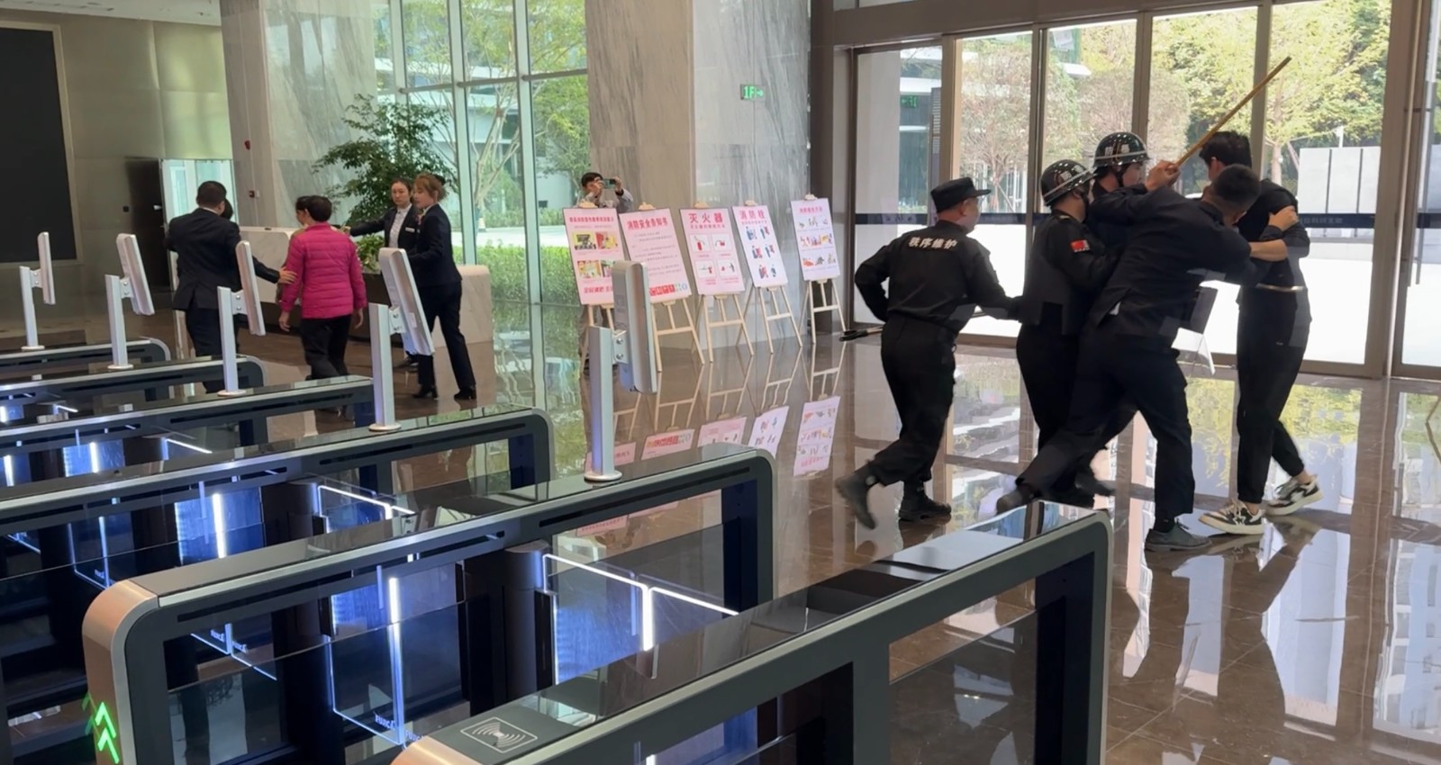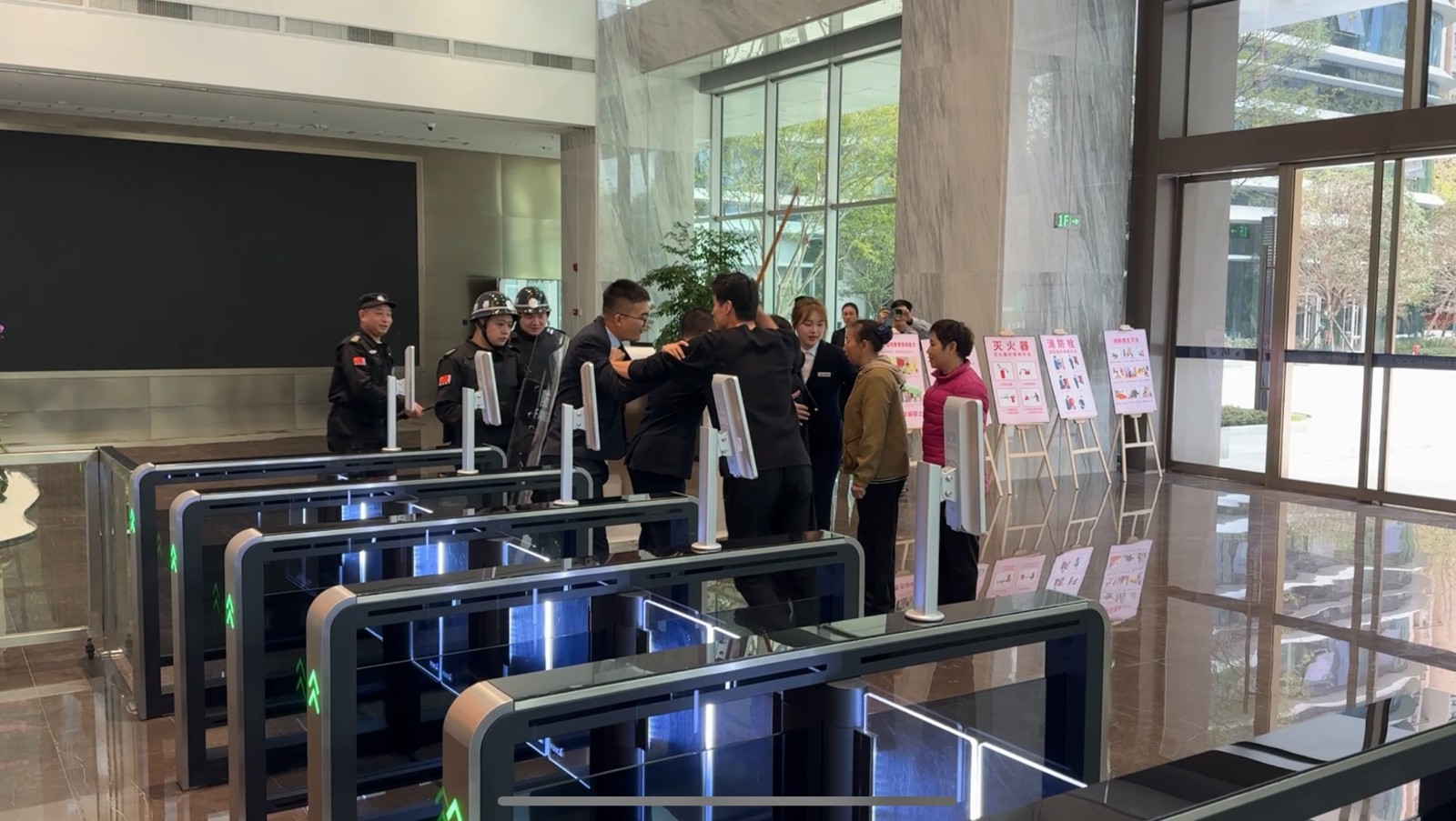 演练模拟了四名手持棍棒的“不法分子”强行闯入大厦的场景。前台人员在第一时间发现异常并迅速通知现场安防人员,安防人员立即采取紧急措施。他们手持防暴器械,勇敢地阻止了“不法分子”的行动,迅速集结并展现出了卓越的团队协作能力。在短短两分钟内,成功将“歹徒”制服,展现了全体员工高效的应对能力。