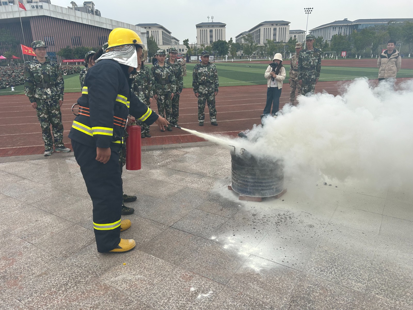 演练现场,高新区消防救援大队站长助理孙世国通过与同学们互动,进一步交流了灭火防护服、避火服、移动照明灯、排烟机、无齿锯、热成像仪和电动扩剪钳等常见消防器材装备的使用,并现场演示了灭火器使用方法,手把手指导学生正确使用灭火器“灭真火”。在消防员的指导下,同学们气氛热烈而有序,穿上灭火防护服,手持干粉灭火器,高压水枪,真正体验了一回“消防员”。