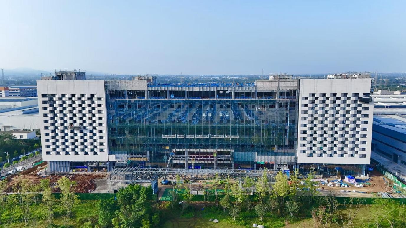在各楼栋建设现场,机电管道安装、建筑内墙装饰、地面铺设、设备安装调试以及绿化等工作正如火如荼地进行;在外电建设方面,厂区内第一条高压供电线路已按计划完成安装及验收,达到通电条件,为后续施工、设备安装提供更充足的电力保障。