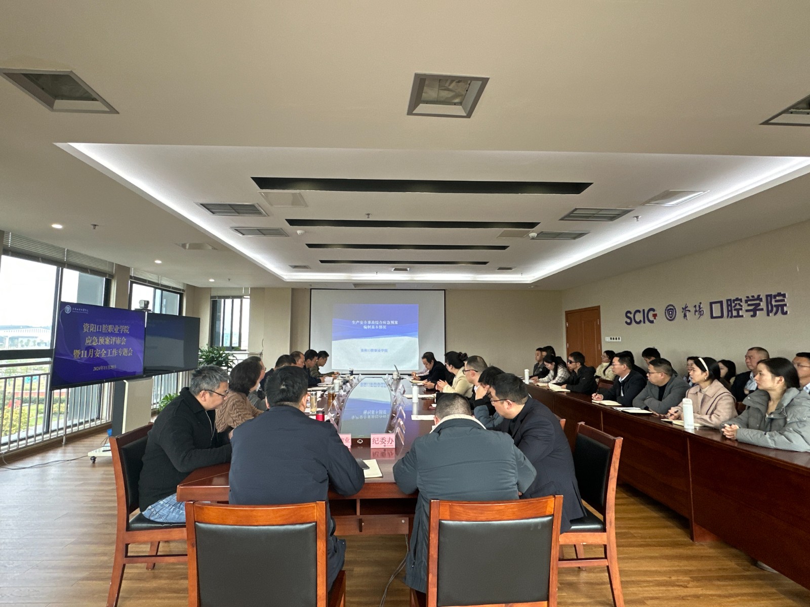 11月28日,资阳口腔职业学院召开应急预案评审会暨11月安全工作专题会,学院在家领导班子出席,应急预案评审专家及编制成员、各部(系)负责人、佳友物业服务中心管理人员、各部(系)安全专员参会,会议由党委委员曹华主持。