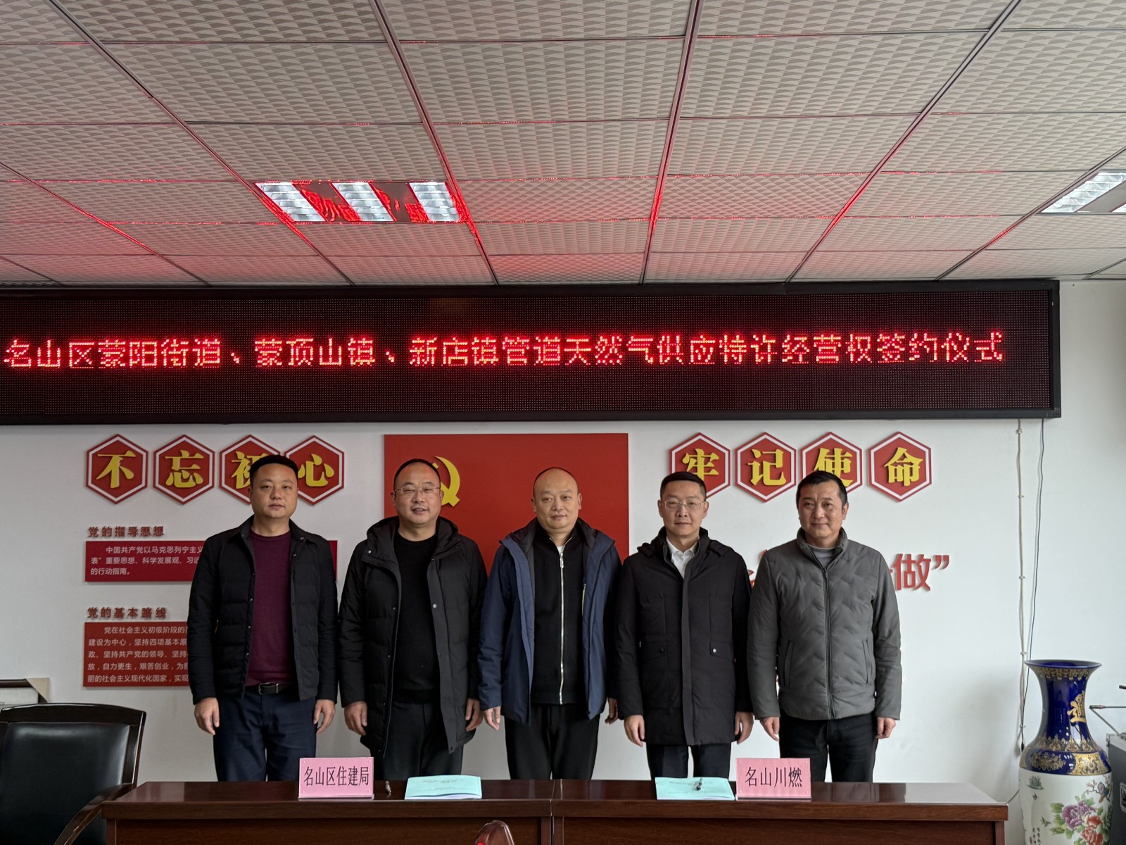 12月18日,名山区蒙阳街道、蒙顶山镇、新店镇管道天然气供应特许经营权签约仪式在名山区住房和城乡建设局举行。名山区人民政府党组成员、副区长谭庆,名山区住房和城乡建设局党委书记秦超俊,名山区住房和城乡建设局局长彭亚雄,川投燃电党委副书记、总经理邓锐,名山川燃党支部书记、董事王镇出席了签约仪式。