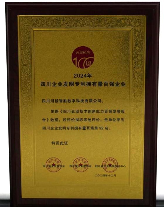 近日,四川省企业联合会、四川省企业家协会在成都召开2024年四川企业技术创新发展大会。大会发布了2024年四川企业技术创新能力百强企业和2024年四川企业发明专利百强企业名单,其中,公司所属川投数科(全称:四川川投智胜数字科技有限公司,原全称:四川川大智胜系统集成有限公司)上榜两项百强名单。