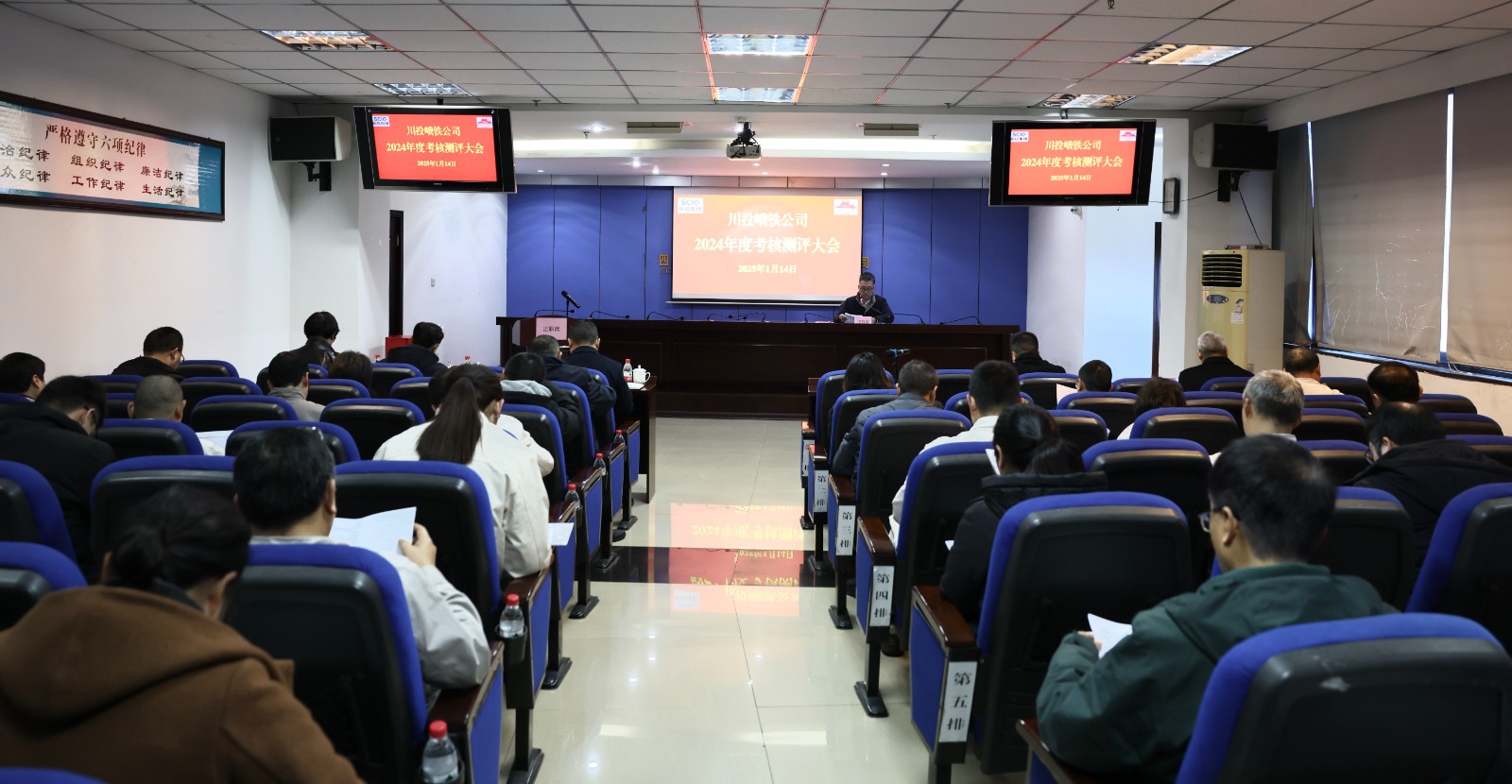 为扎实做好2024年度公司领导班子和班子成员的年度考核,落实公司干部选拔任用工作“一报告两评议”的要求,1月14日,川投峨铁公司召开了2024年度考核测评大会。公司党委书记、董事长李胜章主持会议并讲话。公司在家领导班子成员、外部董事、全体中层管理人员、部分职工代表共48人参加了会议。