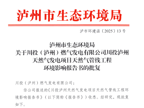 2月13日,《川投泸州天然气发电项目天然气管线工程环境影响报告书》顺利通过泸州市生态环境局审批,成功获得环评批复,这一进展标志着项目天然气管线工程在环境保护方面达到相关要求,为工程“三同时”建设奠定了重要基础,有助于项目的全速推进,也为项目的顺利投产和未来的稳定运行提供了保障。